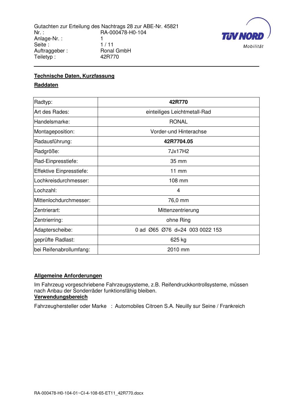 Dieses abe gehört zur Felge Ronal 42R770 in 7Jx17 ET0 mit KBA 45821. Die Seite ist dafür gedacht, dass du schnell prüfen kannst, ob KBA, Design und Größe zu deiner Felge passen und danach direkt das richtige PDF lädst.