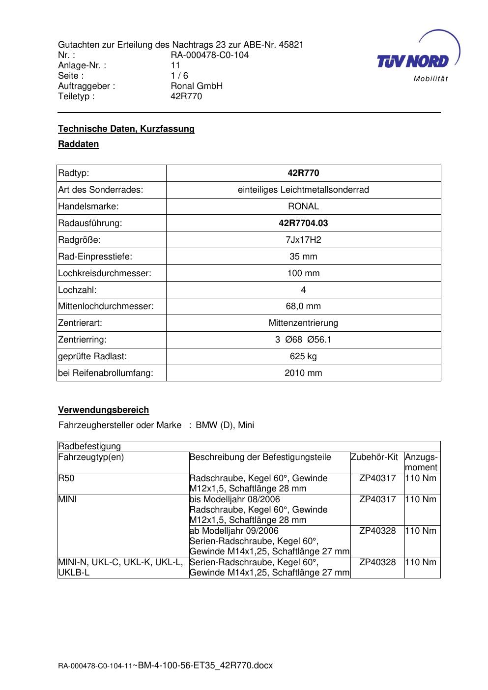 Dieses abe gehört zur Felge Ronal 42R770 in 7Jx17 ET0 mit KBA 45821. Die Seite ist dafür gedacht, dass du schnell prüfen kannst, ob KBA, Design und Größe zu deiner Felge passen und danach direkt das richtige PDF lädst.