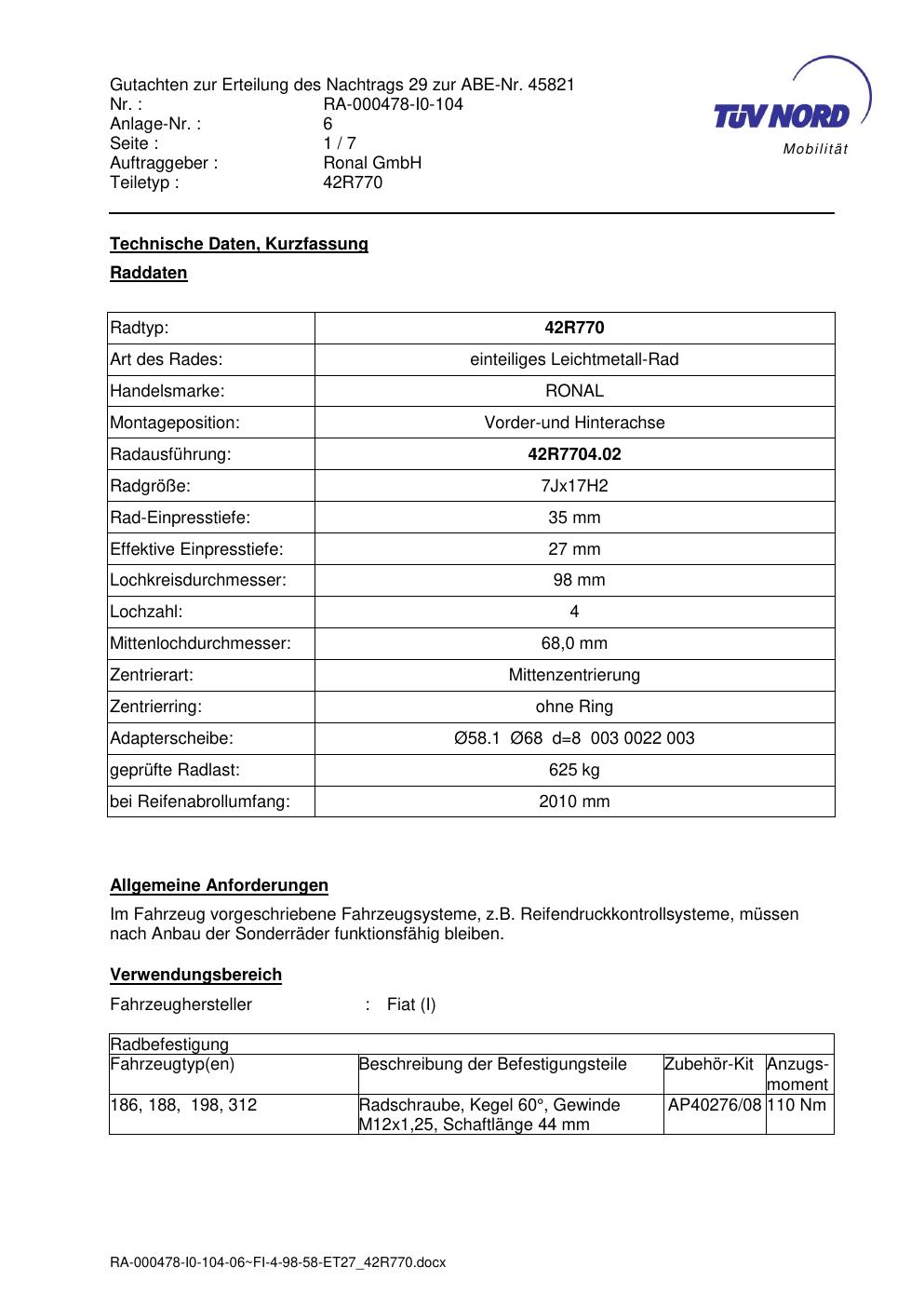 Dieses Gutachten (abe) bezieht sich auf die Alufelge Ronal 42R770 in der Ausführung 7Jx17 ET 0, Mittenloch 0 mm (KBA 45821). Im PDF findest du typischerweise zulässige Reifengrößen, Auflagen/Anbauhinweise und – je nach Dokument – Hinweise zur Eintragung.
