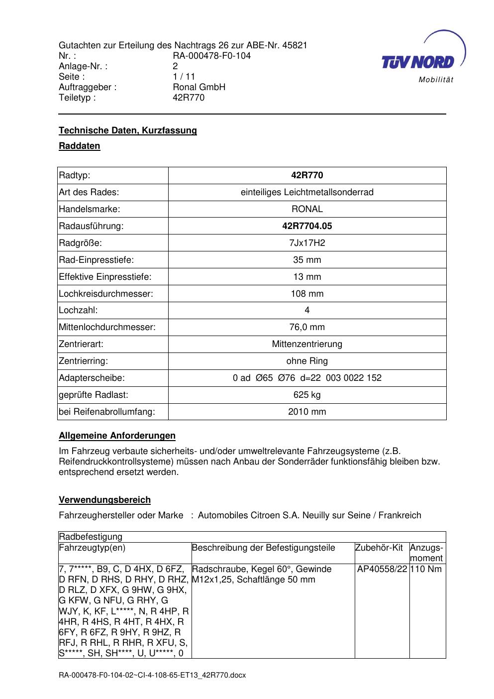 Dieses abe gehört zur Felge Ronal 42R770 in 7Jx17 ET0 mit KBA 45821. Die Seite ist dafür gedacht, dass du schnell prüfen kannst, ob KBA, Design und Größe zu deiner Felge passen und danach direkt das richtige PDF lädst.