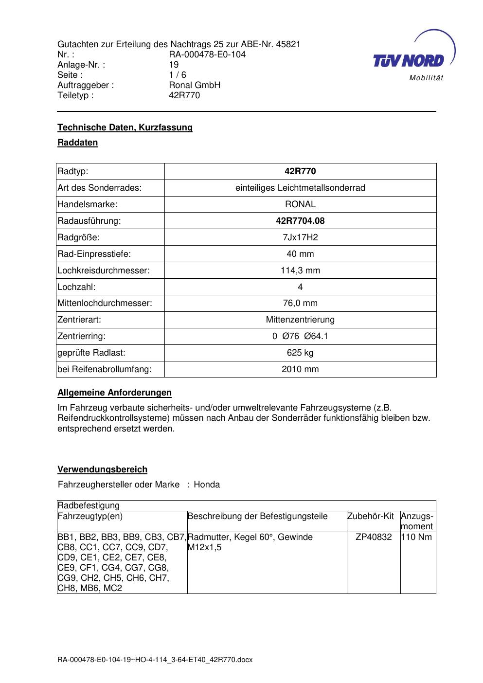 Dieses Gutachten (abe) bezieht sich auf die Alufelge Ronal 42R770 in der Ausführung 7Jx17 ET 0, Mittenloch 0 mm (KBA 45821). Im PDF findest du typischerweise zulässige Reifengrößen, Auflagen/Anbauhinweise und – je nach Dokument – Hinweise zur Eintragung.