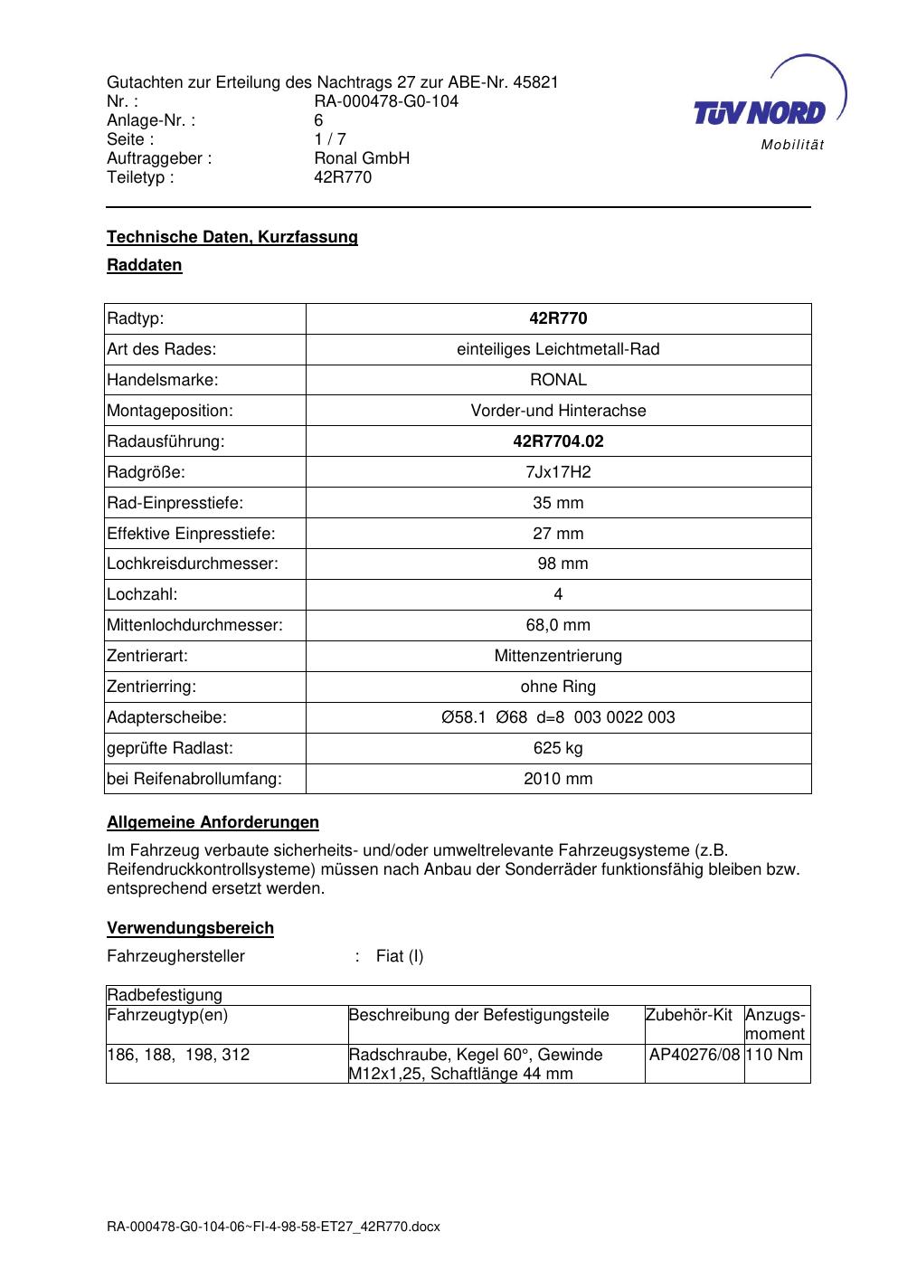 Dieses Gutachten (abe) bezieht sich auf die Alufelge Ronal 42R770 in der Ausführung 7Jx17 ET 0, Mittenloch 0 mm (KBA 45821). Im PDF findest du typischerweise zulässige Reifengrößen, Auflagen/Anbauhinweise und – je nach Dokument – Hinweise zur Eintragung.