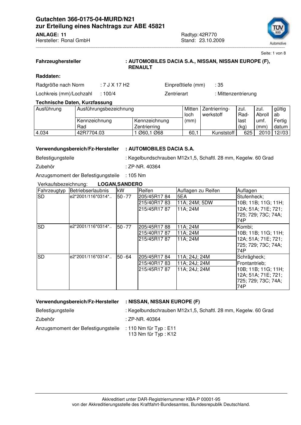 Dieses Gutachten (abe) bezieht sich auf die Alufelge Ronal 42R770 in der Ausführung 7Jx17 ET 0, Mittenloch 0 mm (KBA 45821). Im PDF findest du typischerweise zulässige Reifengrößen, Auflagen/Anbauhinweise und – je nach Dokument – Hinweise zur Eintragung.