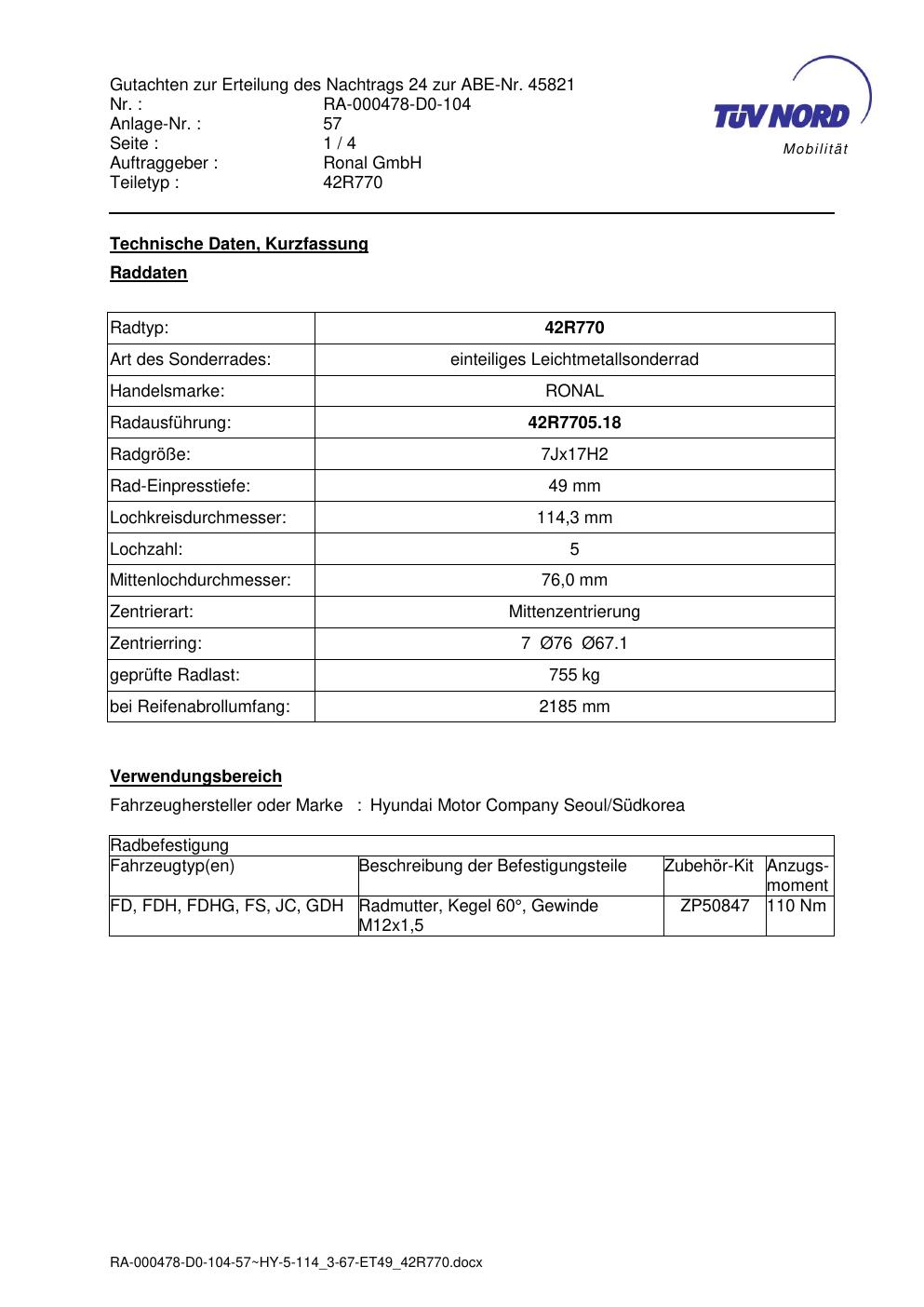 Diese Allgemeine Betriebserlaubnis (ABE) bezieht sich auf die Felge Ronal 42R770 in der Ausführung 7Jx17 ET0 mit der KBA 45821. Eine ABE ist eine bauartspezifische Genehmigung, die der Hersteller beim Kraftfahrt-Bundesamt (KBA) erwirkt hat. Sie erlaubt die Verwendung der Felge an den im Dokument genannten Fahrzeugen ohne zusätzliche Einzelabnahme, solange sämtliche im Gutachten aufgeführten Auflagen eingehalten werden.