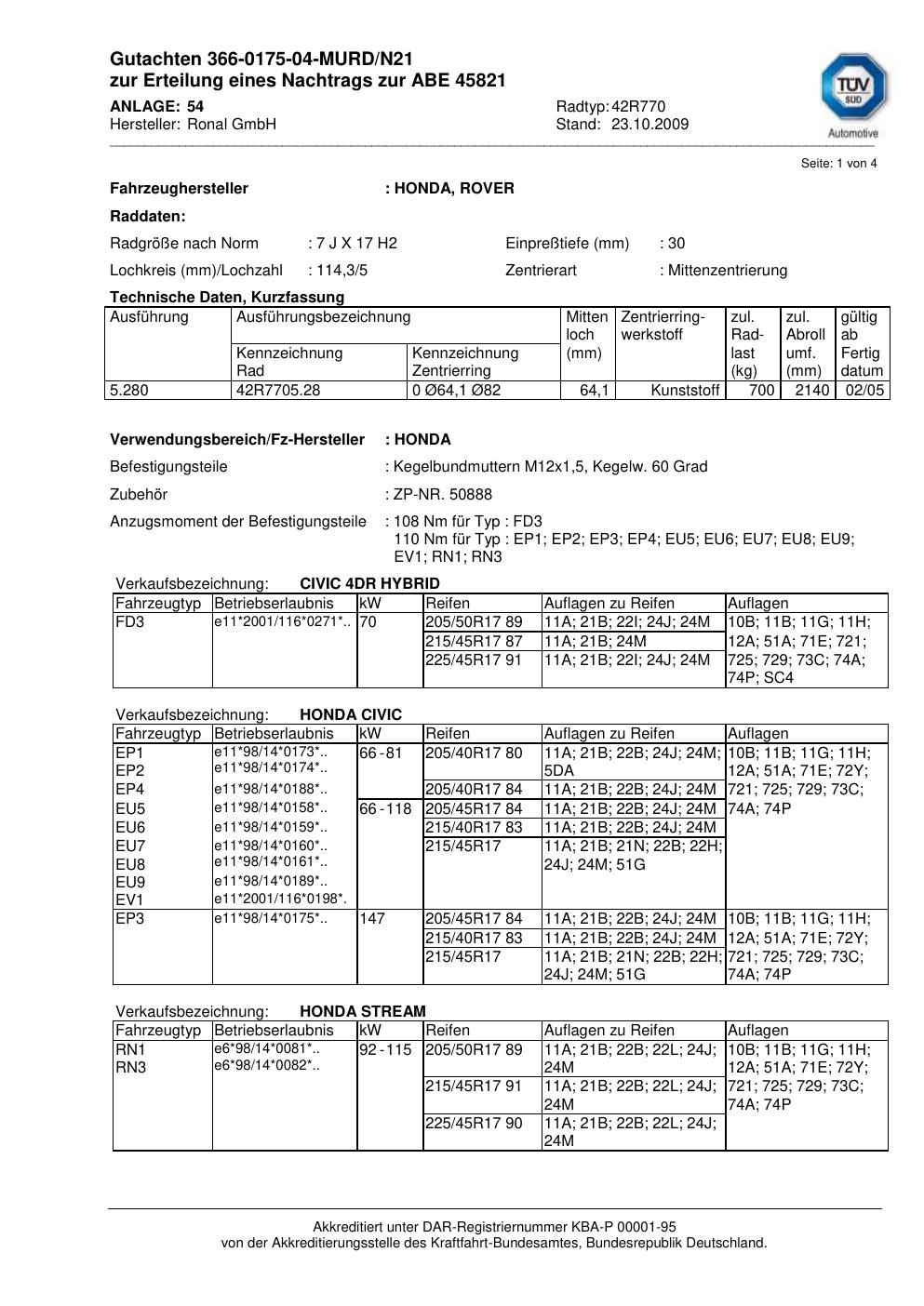 Dieses Gutachten (abe) bezieht sich auf die Alufelge Ronal 42R770 in der Ausführung 7Jx17 ET 0, Mittenloch 0 mm (KBA 45821). Im PDF findest du typischerweise zulässige Reifengrößen, Auflagen/Anbauhinweise und – je nach Dokument – Hinweise zur Eintragung.