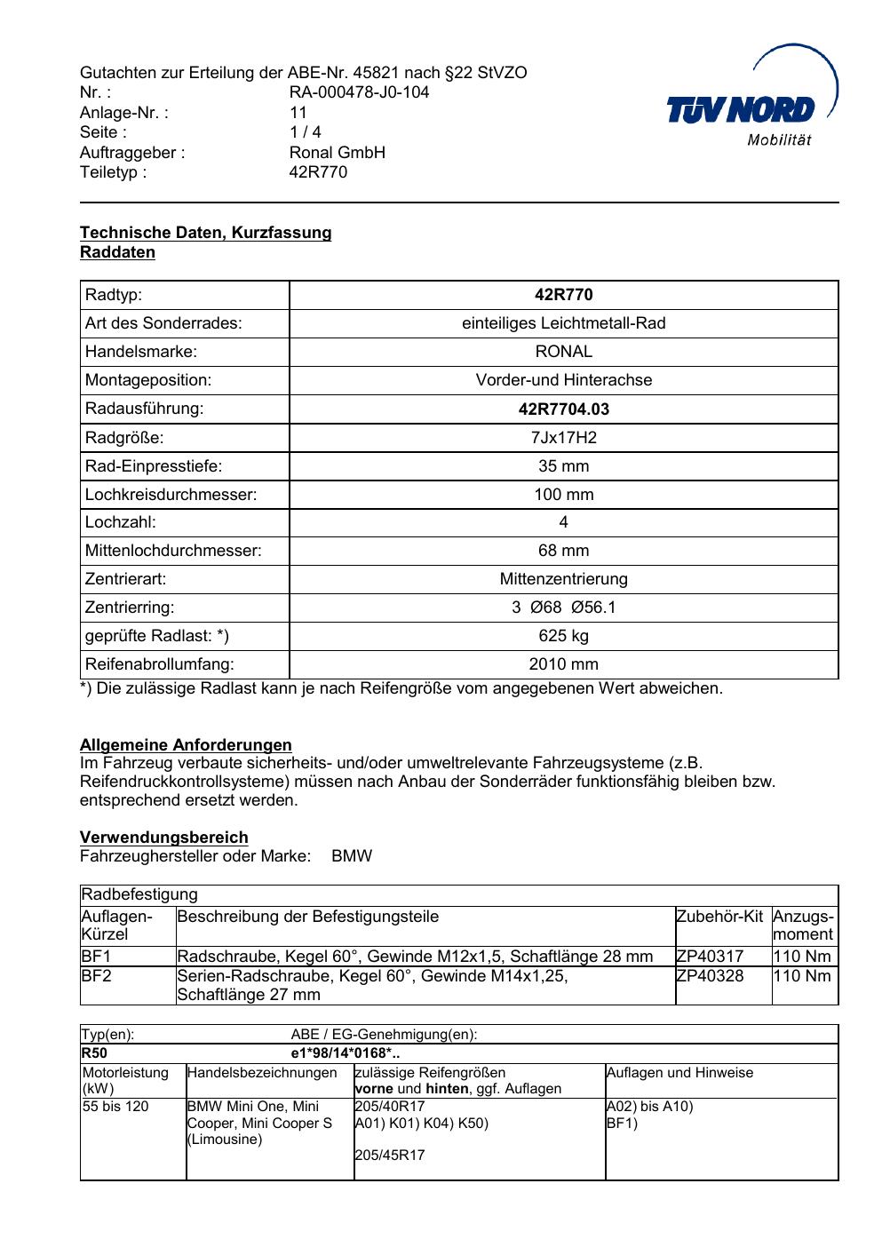 Dieses Gutachten (abe) bezieht sich auf die Alufelge Ronal 42R770 in der Ausführung 7Jx17 ET 0, Mittenloch 0 mm (KBA 45821). Im PDF findest du typischerweise zulässige Reifengrößen, Auflagen/Anbauhinweise und – je nach Dokument – Hinweise zur Eintragung.