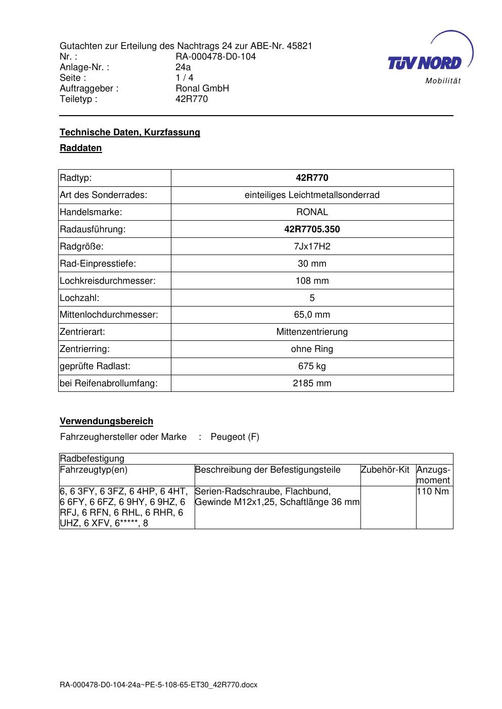 Dieses Gutachten (abe) bezieht sich auf die Alufelge Ronal 42R770 in der Ausführung 7Jx17 ET 0, Mittenloch 0 mm (KBA 45821). Im PDF findest du typischerweise zulässige Reifengrößen, Auflagen/Anbauhinweise und – je nach Dokument – Hinweise zur Eintragung.