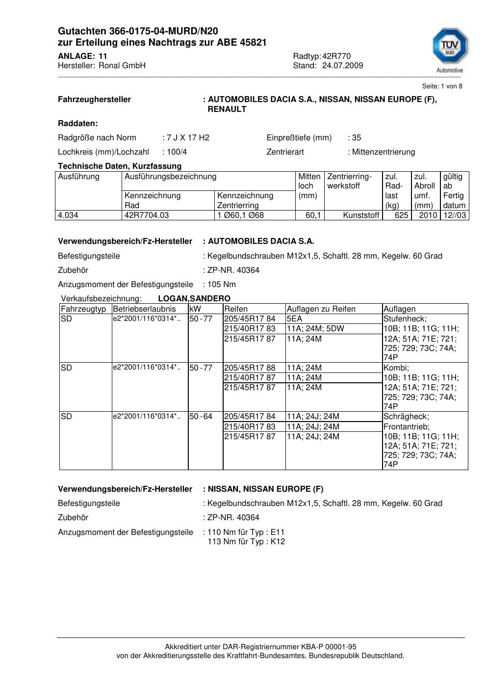 Dieses Gutachten (abe) bezieht sich auf die Alufelge Ronal 42R770 in der Ausführung 7Jx17 ET 0, Mittenloch 0 mm (KBA 45821). Im PDF findest du typischerweise zulässige Reifengrößen, Auflagen/Anbauhinweise und – je nach Dokument – Hinweise zur Eintragung.