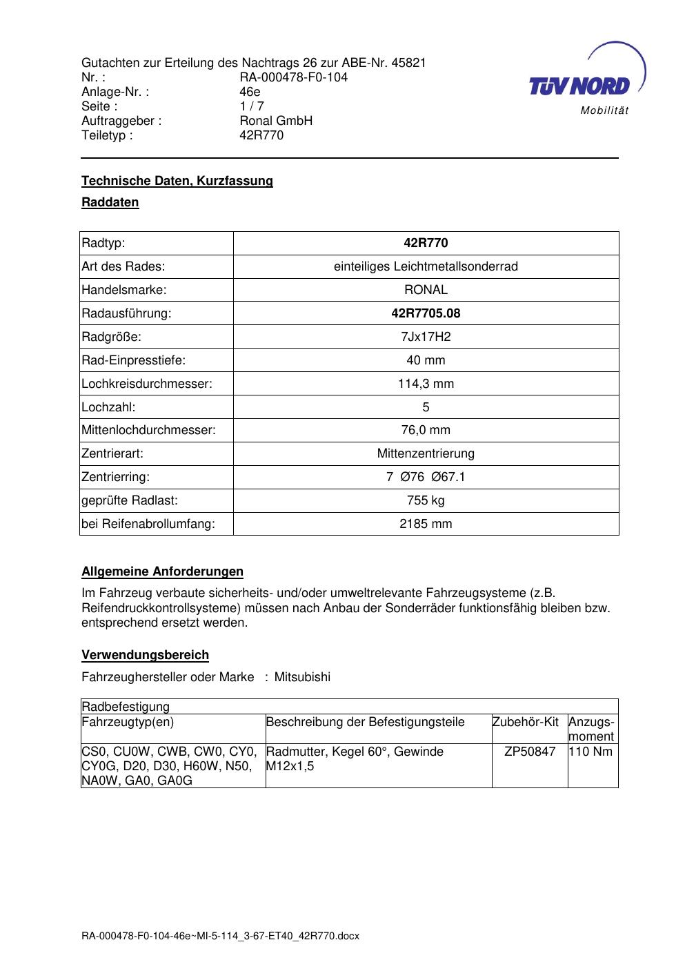 Dieses abe der Marke Ronal stammt vom jeweiligen Hersteller, Importeur oder einer Prüforganisation. Felgengutachten.de beansprucht hieran keine eigenen Urheber-, Nutzungs- oder sonstigen Schutzrechte. Soweit das Dokument urheber- oder leistungsschutzrechtlich geschützt ist, verbleiben die Rechte beim jeweiligen Rechteinhaber. Die Bereitstellung erfolgt ausschließlich zu Informationszwecken für Endnutzer, z. B. zur Vorlage bei Prüfstellen oder zur eigenen Fahrzeugdokumentation.