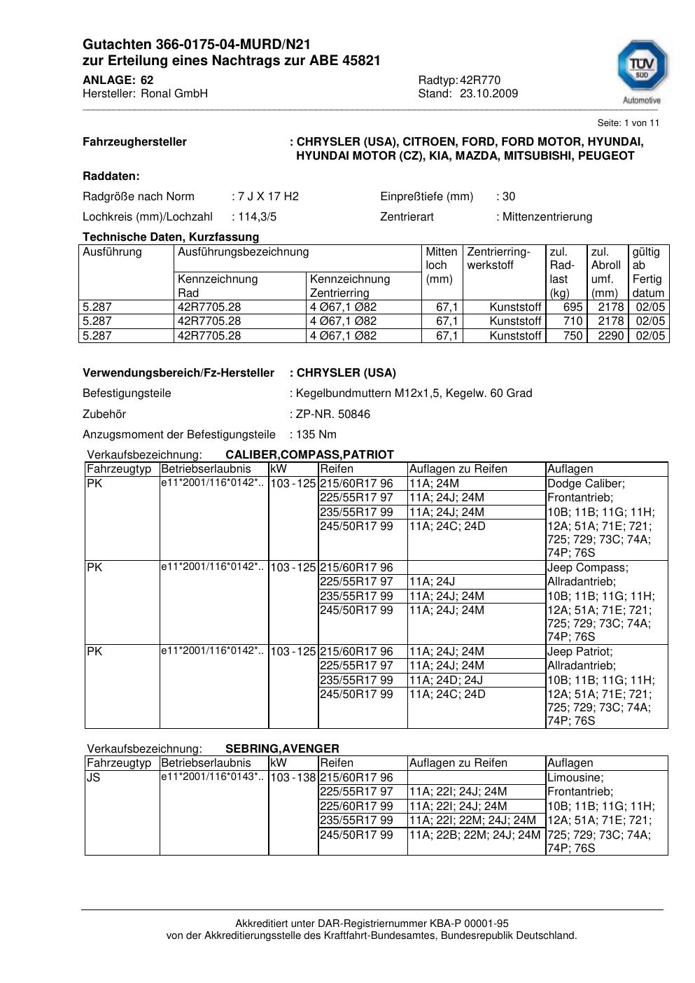 Dieses Gutachten (abe) bezieht sich auf die Alufelge Ronal 42R770 in der Ausführung 7Jx17 ET 0, Mittenloch 0 mm (KBA 45821). Im PDF findest du typischerweise zulässige Reifengrößen, Auflagen/Anbauhinweise und – je nach Dokument – Hinweise zur Eintragung.