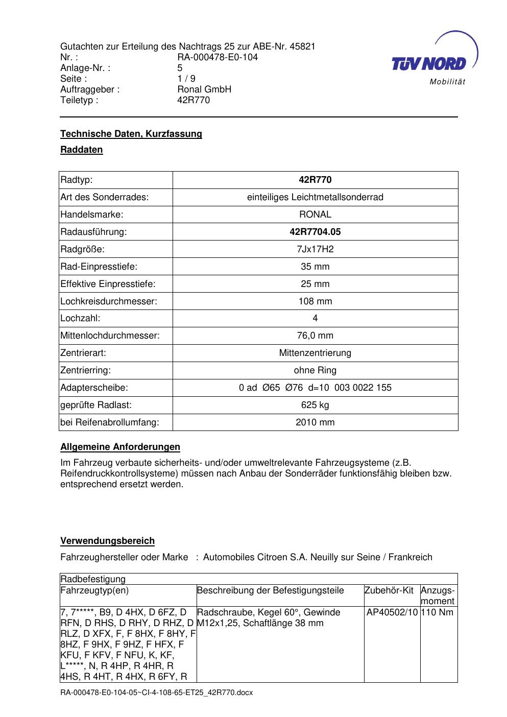 Dieses Gutachten (abe) bezieht sich auf die Alufelge Ronal 42R770 in der Ausführung 7Jx17 ET 0, Mittenloch 0 mm (KBA 45821). Im PDF findest du typischerweise zulässige Reifengrößen, Auflagen/Anbauhinweise und – je nach Dokument – Hinweise zur Eintragung.