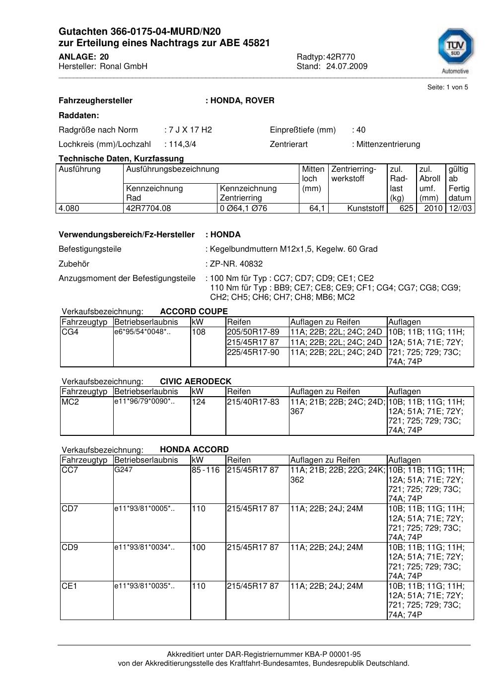 Dieses Gutachten (abe) bezieht sich auf die Alufelge Ronal 42R770 in der Ausführung 7Jx17 ET 0, Mittenloch 0 mm (KBA 45821). Im PDF findest du typischerweise zulässige Reifengrößen, Auflagen/Anbauhinweise und – je nach Dokument – Hinweise zur Eintragung.