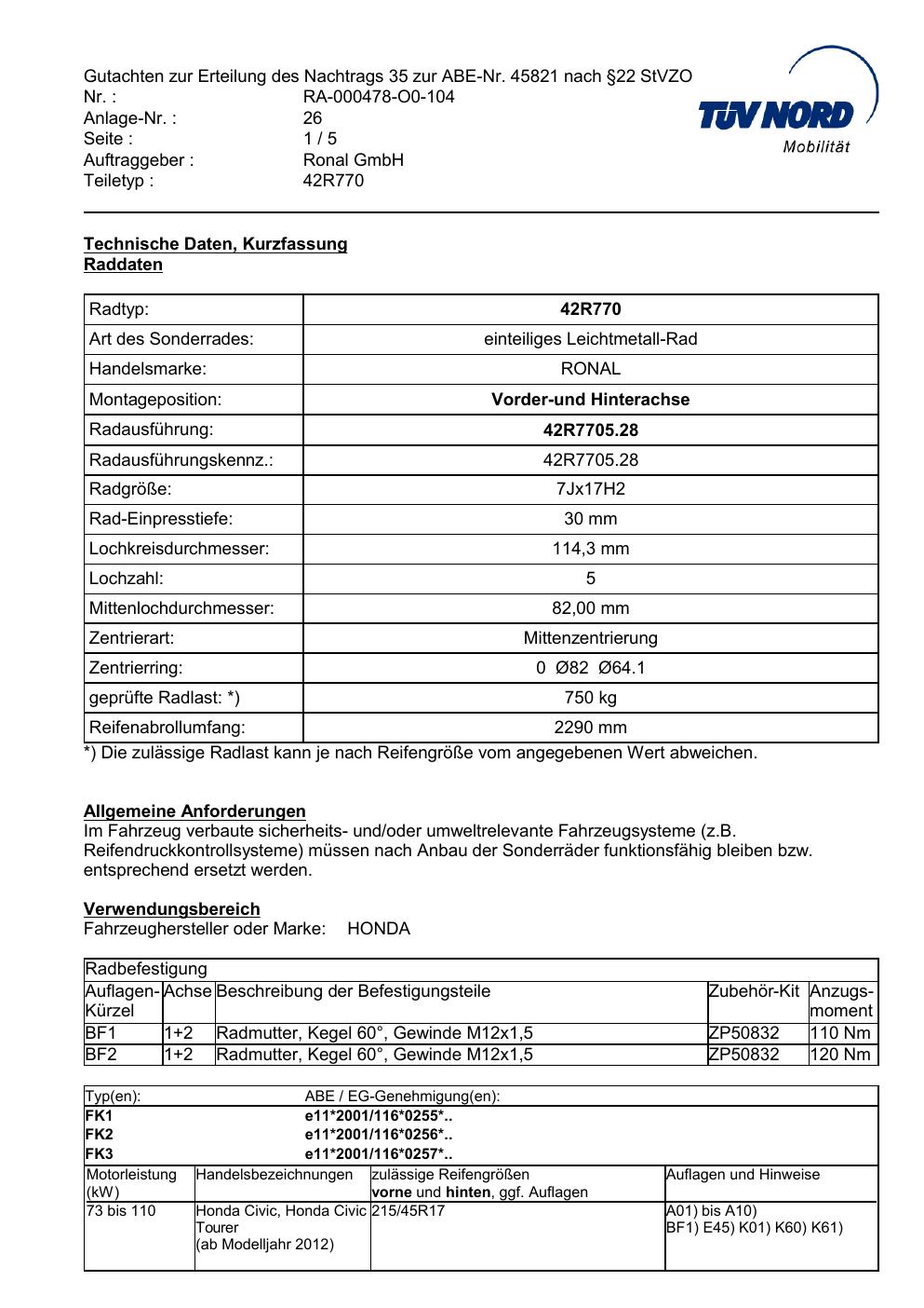 Dieses Gutachten (abe) bezieht sich auf die Alufelge Ronal 42R770 in der Ausführung 7Jx17 ET 0, Mittenloch 0 mm (KBA 45821). Im PDF findest du typischerweise zulässige Reifengrößen, Auflagen/Anbauhinweise und – je nach Dokument – Hinweise zur Eintragung.