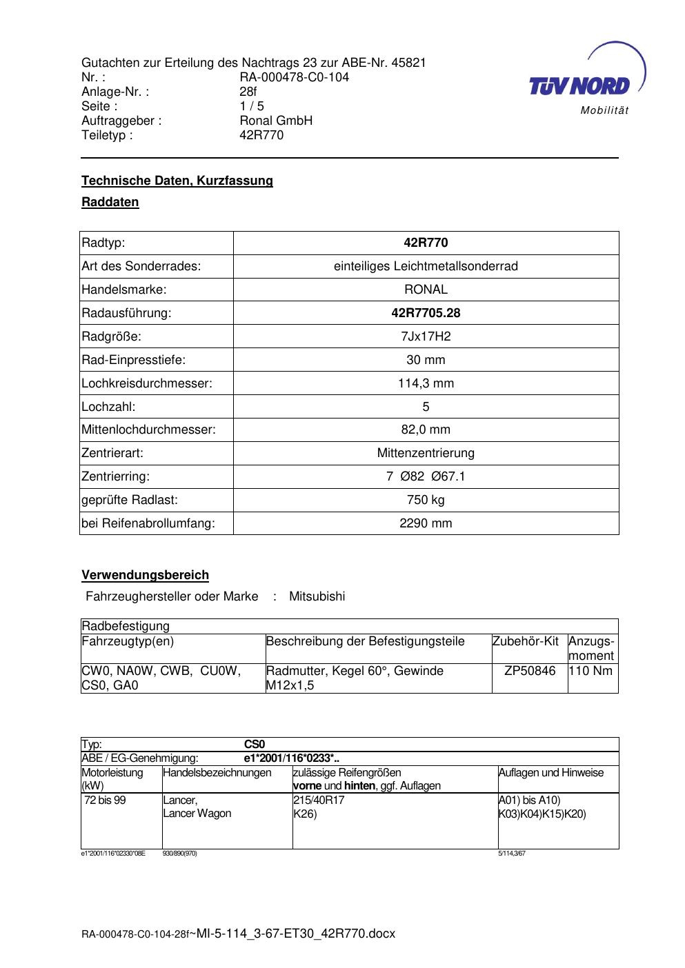 Diese Allgemeine Betriebserlaubnis (ABE) bezieht sich auf die Felge Ronal 42R770 in der Ausführung 7Jx17 ET0 mit der KBA 45821. Eine ABE ist eine bauartspezifische Genehmigung, die der Hersteller beim Kraftfahrt-Bundesamt (KBA) erwirkt hat. Sie erlaubt die Verwendung der Felge an den im Dokument genannten Fahrzeugen ohne zusätzliche Einzelabnahme, solange sämtliche im Gutachten aufgeführten Auflagen eingehalten werden.