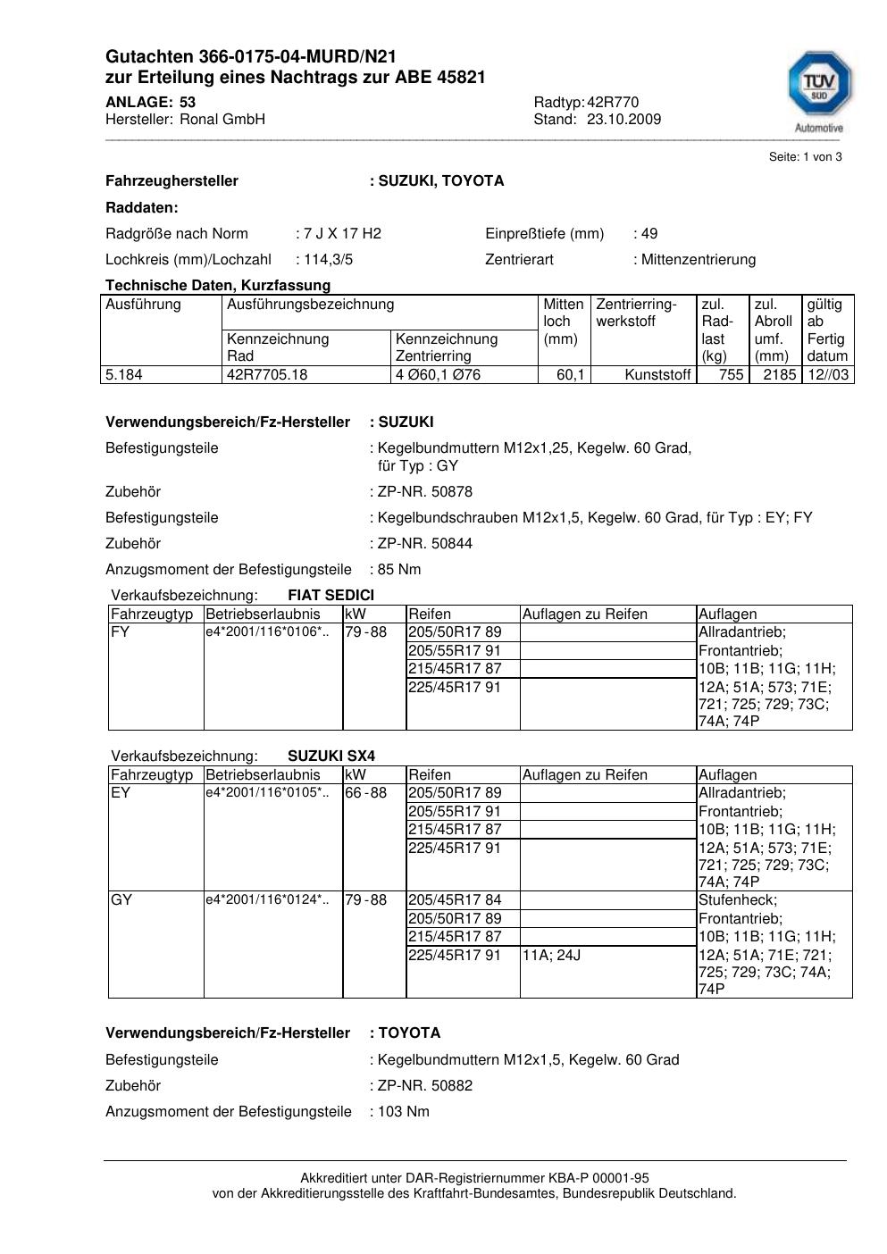 Dieses Gutachten (abe) bezieht sich auf die Alufelge Ronal 42R770 in der Ausführung 7Jx17 ET 0, Mittenloch 0 mm (KBA 45821). Im PDF findest du typischerweise zulässige Reifengrößen, Auflagen/Anbauhinweise und – je nach Dokument – Hinweise zur Eintragung.