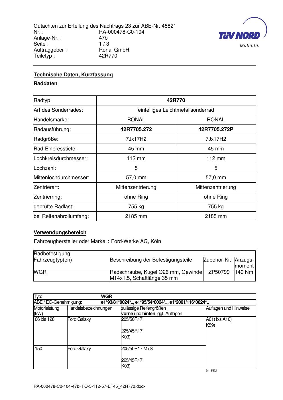 Dieses Gutachten (abe) bezieht sich auf die Alufelge Ronal 42R770 in der Ausführung 7Jx17 ET 0, Mittenloch 0 mm (KBA 45821). Im PDF findest du typischerweise zulässige Reifengrößen, Auflagen/Anbauhinweise und – je nach Dokument – Hinweise zur Eintragung.