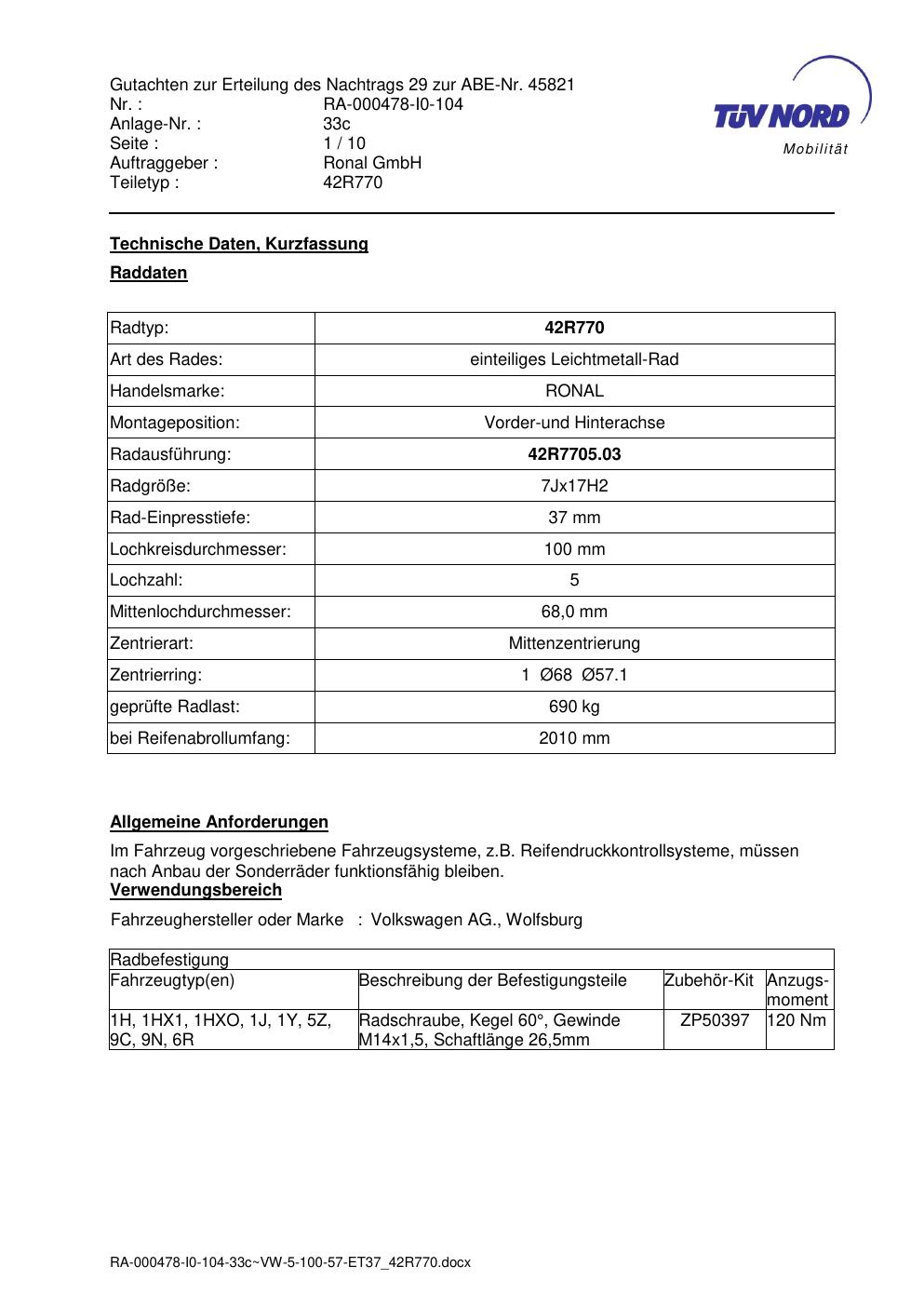 Dieses Gutachten (abe) bezieht sich auf die Alufelge Ronal 42R770 in der Ausführung 7Jx17 ET 0, Mittenloch 0 mm (KBA 45821). Im PDF findest du typischerweise zulässige Reifengrößen, Auflagen/Anbauhinweise und – je nach Dokument – Hinweise zur Eintragung.
