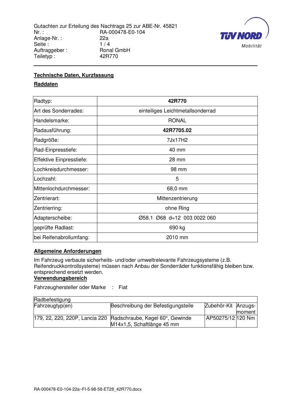 Dieses abe gehört zur Felge Ronal 42R770 in 7Jx17 ET0 mit KBA 45821. Die Seite ist dafür gedacht, dass du schnell prüfen kannst, ob KBA, Design und Größe zu deiner Felge passen und danach direkt das richtige PDF lädst.