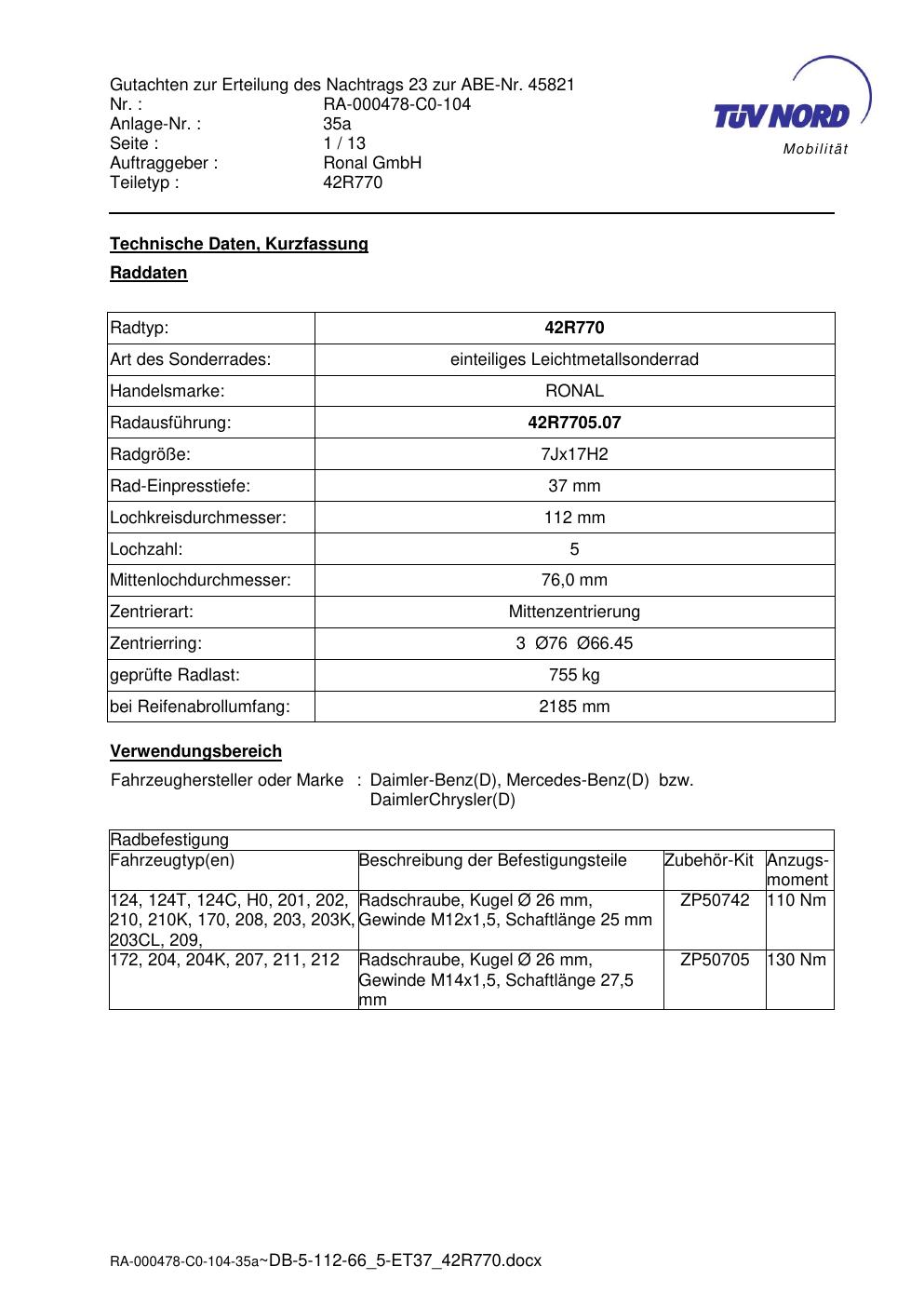 Dieses Gutachten (abe) bezieht sich auf die Alufelge Ronal 42R770 in der Ausführung 7Jx17 ET 0, Mittenloch 0 mm (KBA 45821). Im PDF findest du typischerweise zulässige Reifengrößen, Auflagen/Anbauhinweise und – je nach Dokument – Hinweise zur Eintragung.