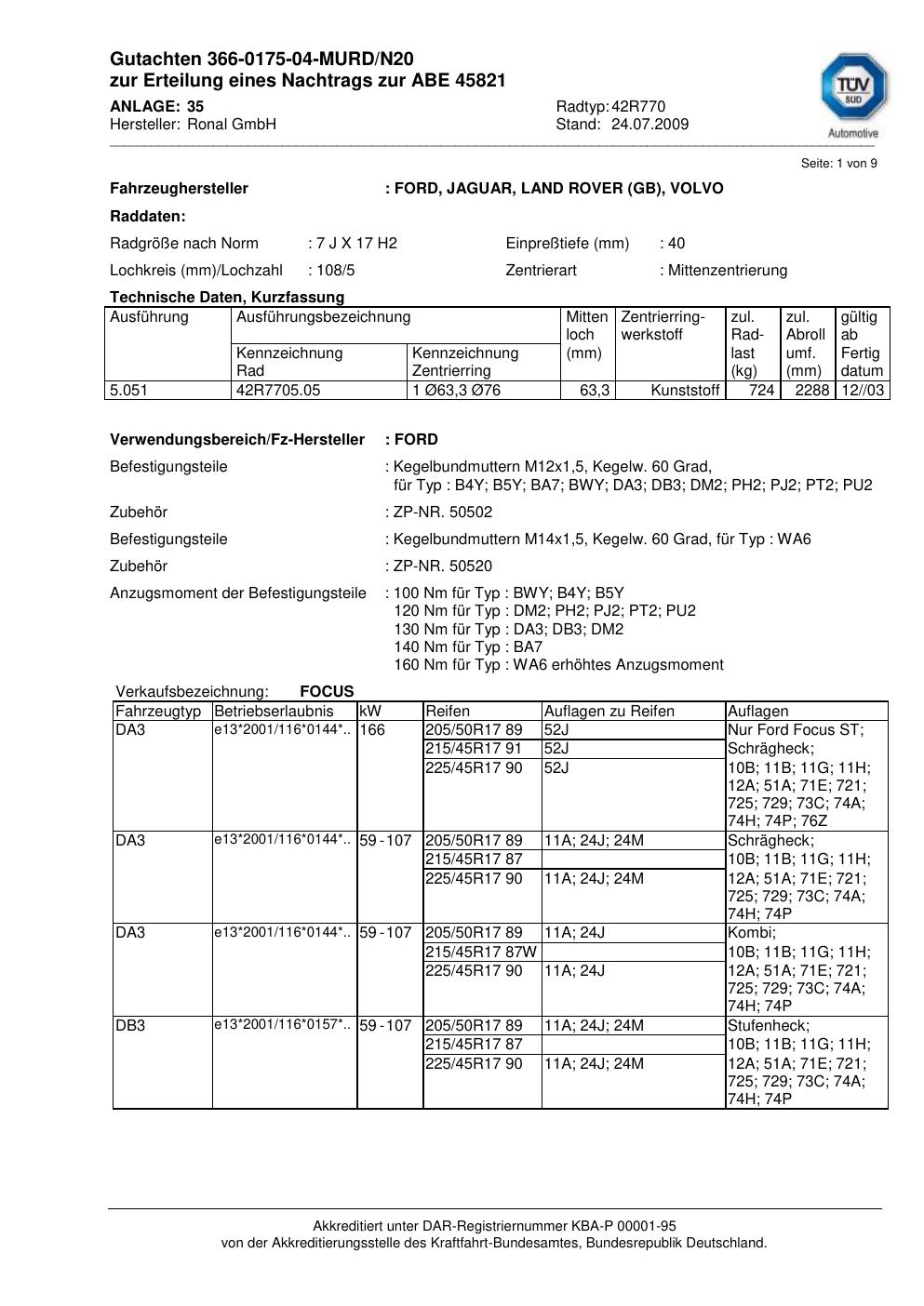 Dieses Gutachten (abe) bezieht sich auf die Alufelge Ronal 42R770 in der Ausführung 7Jx17 ET 0, Mittenloch 0 mm (KBA 45821). Im PDF findest du typischerweise zulässige Reifengrößen, Auflagen/Anbauhinweise und – je nach Dokument – Hinweise zur Eintragung.
