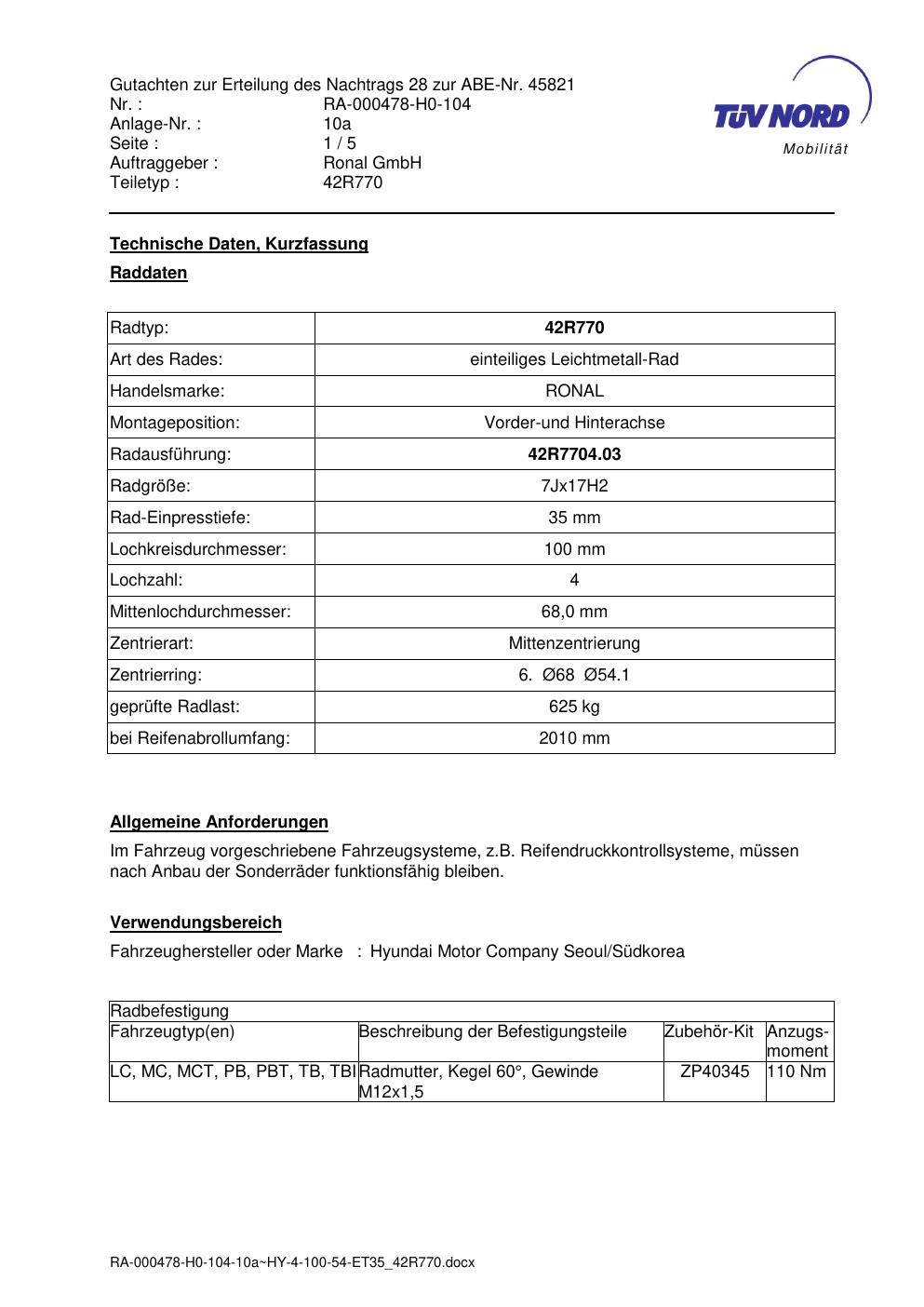 Dieses Gutachten (abe) bezieht sich auf die Alufelge Ronal 42R770 in der Ausführung 7Jx17 ET 0, Mittenloch 0 mm (KBA 45821). Im PDF findest du typischerweise zulässige Reifengrößen, Auflagen/Anbauhinweise und – je nach Dokument – Hinweise zur Eintragung.
