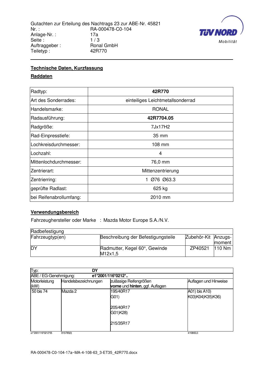 Dieses abe gehört zur Felge Ronal 42R770 in 7Jx17 ET0 mit KBA 45821. Die Seite ist dafür gedacht, dass du schnell prüfen kannst, ob KBA, Design und Größe zu deiner Felge passen und danach direkt das richtige PDF lädst.