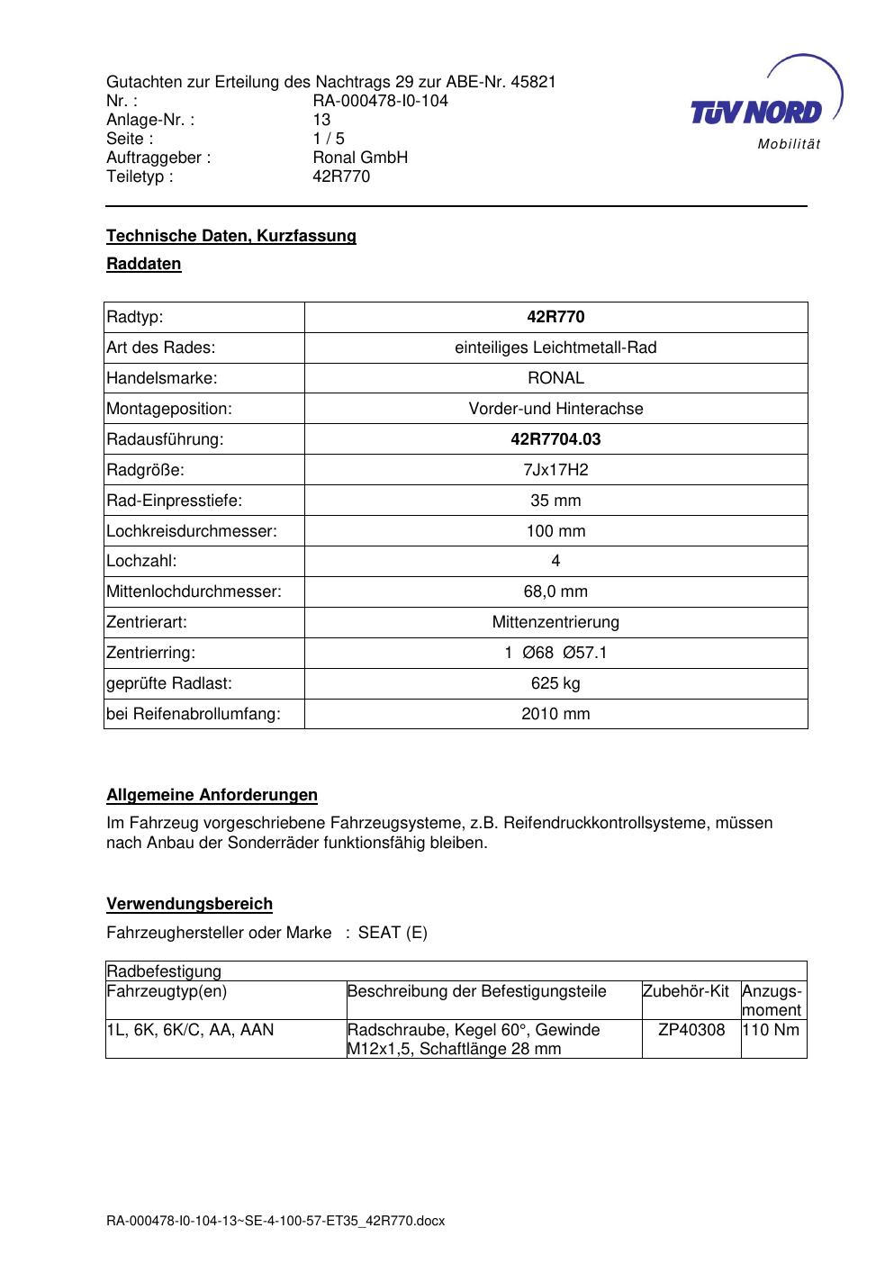 Dieses Gutachten (abe) bezieht sich auf die Alufelge Ronal 42R770 in der Ausführung 7Jx17 ET 0, Mittenloch 0 mm (KBA 45821). Im PDF findest du typischerweise zulässige Reifengrößen, Auflagen/Anbauhinweise und – je nach Dokument – Hinweise zur Eintragung.