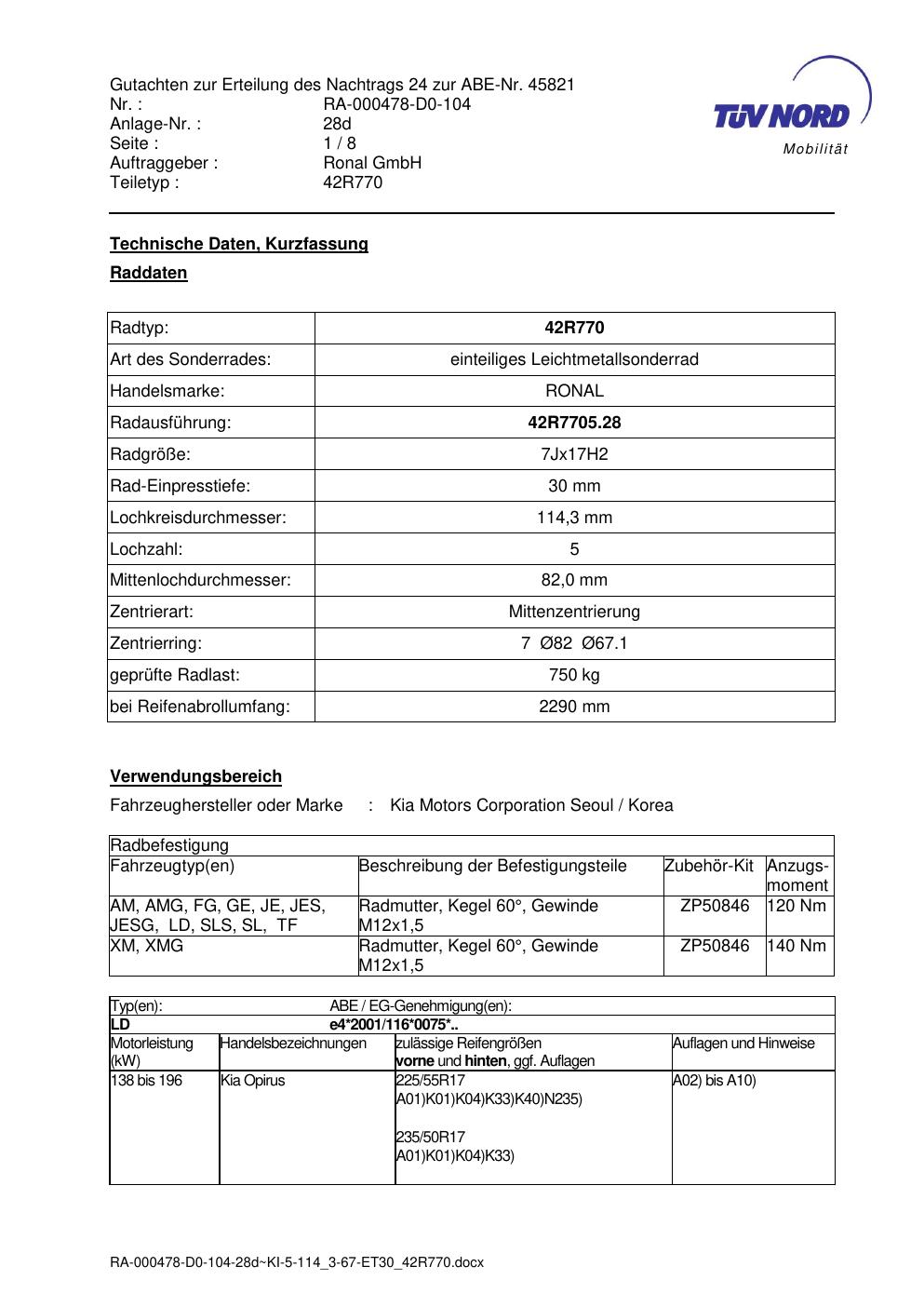 Dieses Gutachten (abe) bezieht sich auf die Alufelge Ronal 42R770 in der Ausführung 7Jx17 ET 0, Mittenloch 0 mm (KBA 45821). Im PDF findest du typischerweise zulässige Reifengrößen, Auflagen/Anbauhinweise und – je nach Dokument – Hinweise zur Eintragung.