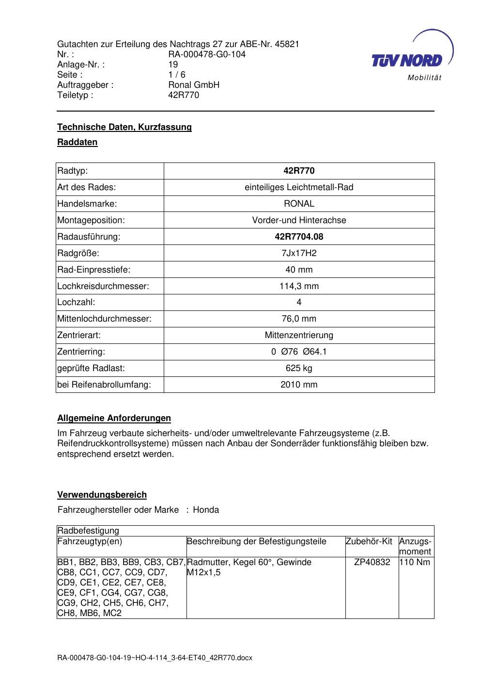 • Stimmt die KBA-Nummer auf der Felge mit diesem Dokument überein?