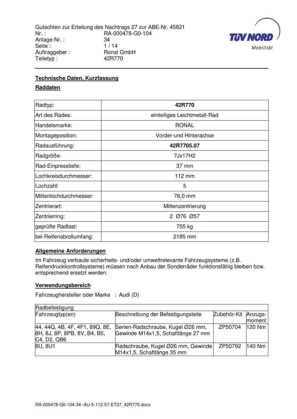 Dieses Gutachten (abe) bezieht sich auf die Alufelge Ronal 42R770 in der Ausführung 7Jx17 ET 0, Mittenloch 0 mm (KBA 45821). Im PDF findest du typischerweise zulässige Reifengrößen, Auflagen/Anbauhinweise und – je nach Dokument – Hinweise zur Eintragung.