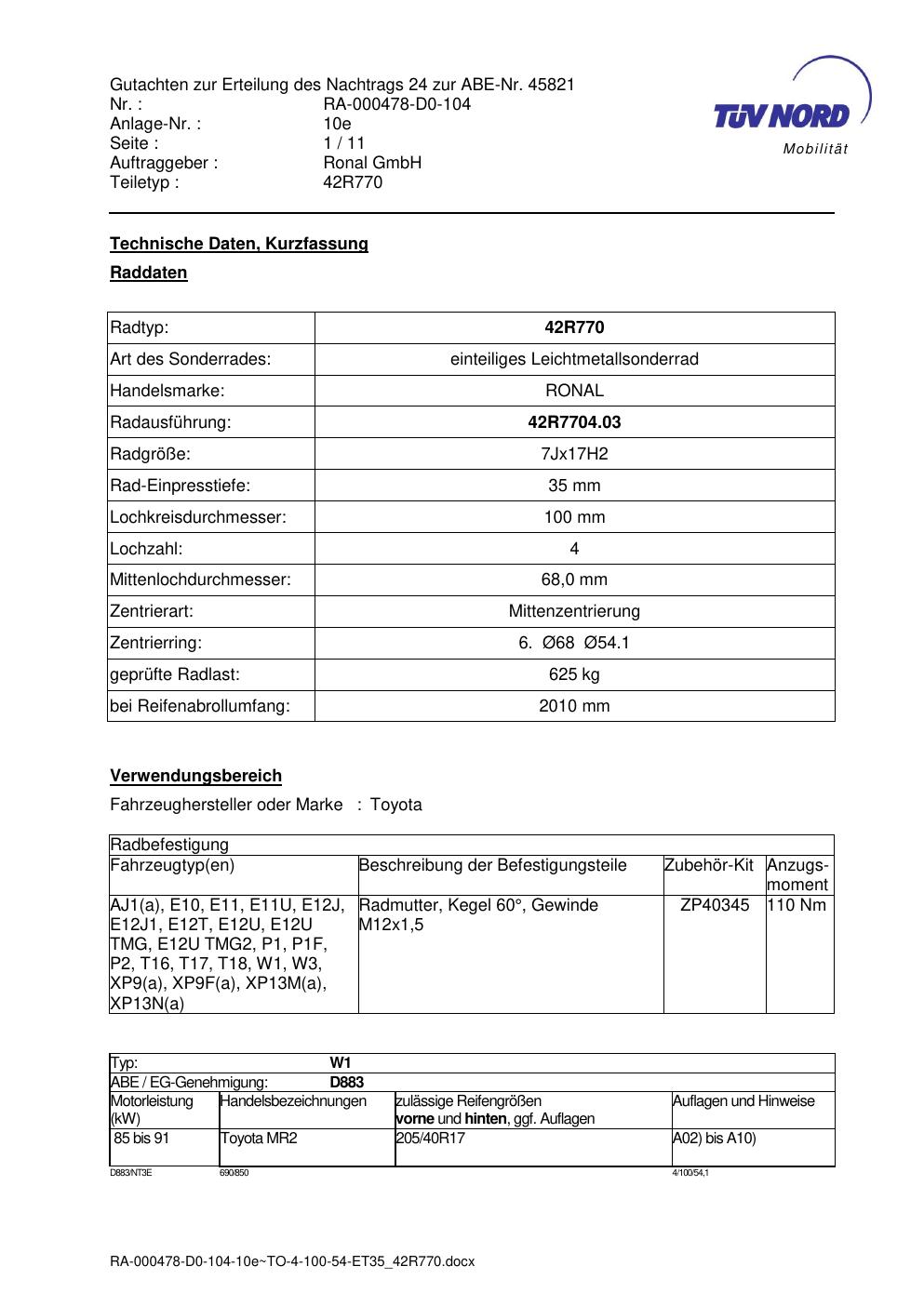 Dieses Gutachten (abe) bezieht sich auf die Alufelge Ronal 42R770 in der Ausführung 7Jx17 ET 0, Mittenloch 0 mm (KBA 45821). Im PDF findest du typischerweise zulässige Reifengrößen, Auflagen/Anbauhinweise und – je nach Dokument – Hinweise zur Eintragung.