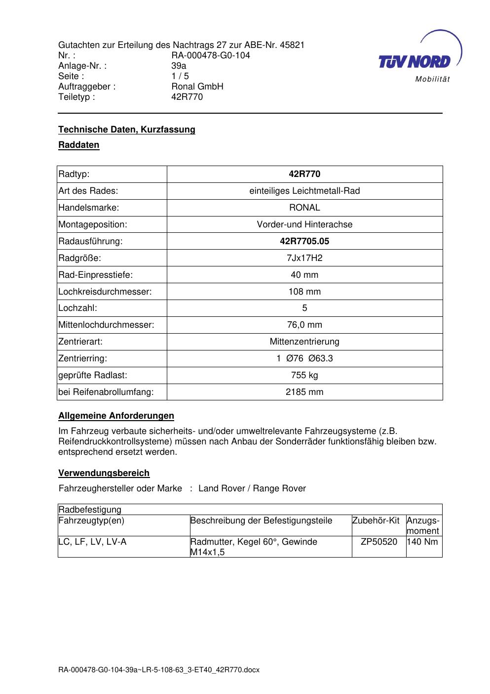 Dieses Gutachten (abe) bezieht sich auf die Alufelge Ronal 42R770 in der Ausführung 7Jx17 ET 0, Mittenloch 0 mm (KBA 45821). Im PDF findest du typischerweise zulässige Reifengrößen, Auflagen/Anbauhinweise und – je nach Dokument – Hinweise zur Eintragung.