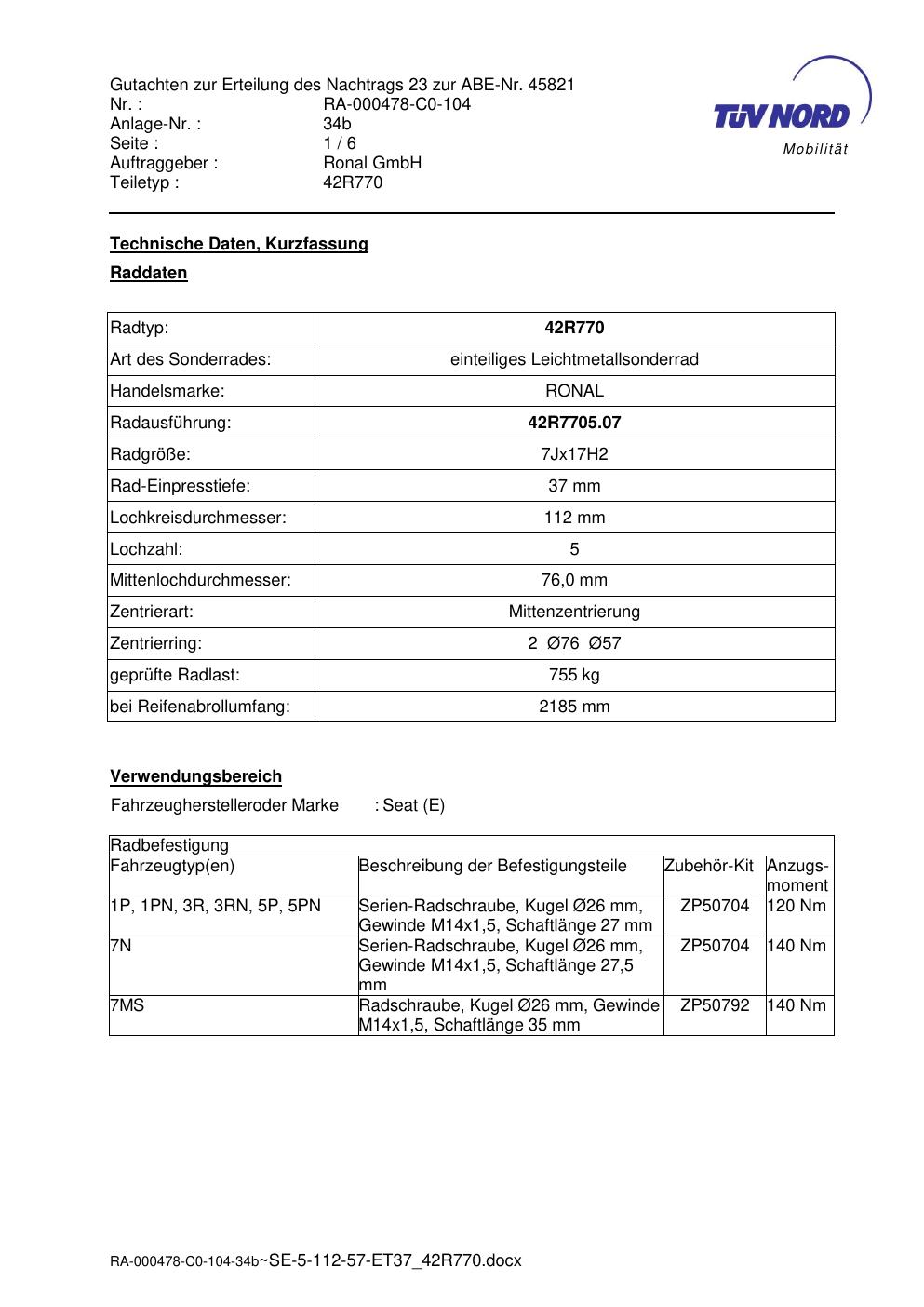 Dieses Gutachten (abe) bezieht sich auf die Alufelge Ronal 42R770 in der Ausführung 7Jx17 ET 0, Mittenloch 0 mm (KBA 45821). Im PDF findest du typischerweise zulässige Reifengrößen, Auflagen/Anbauhinweise und – je nach Dokument – Hinweise zur Eintragung.