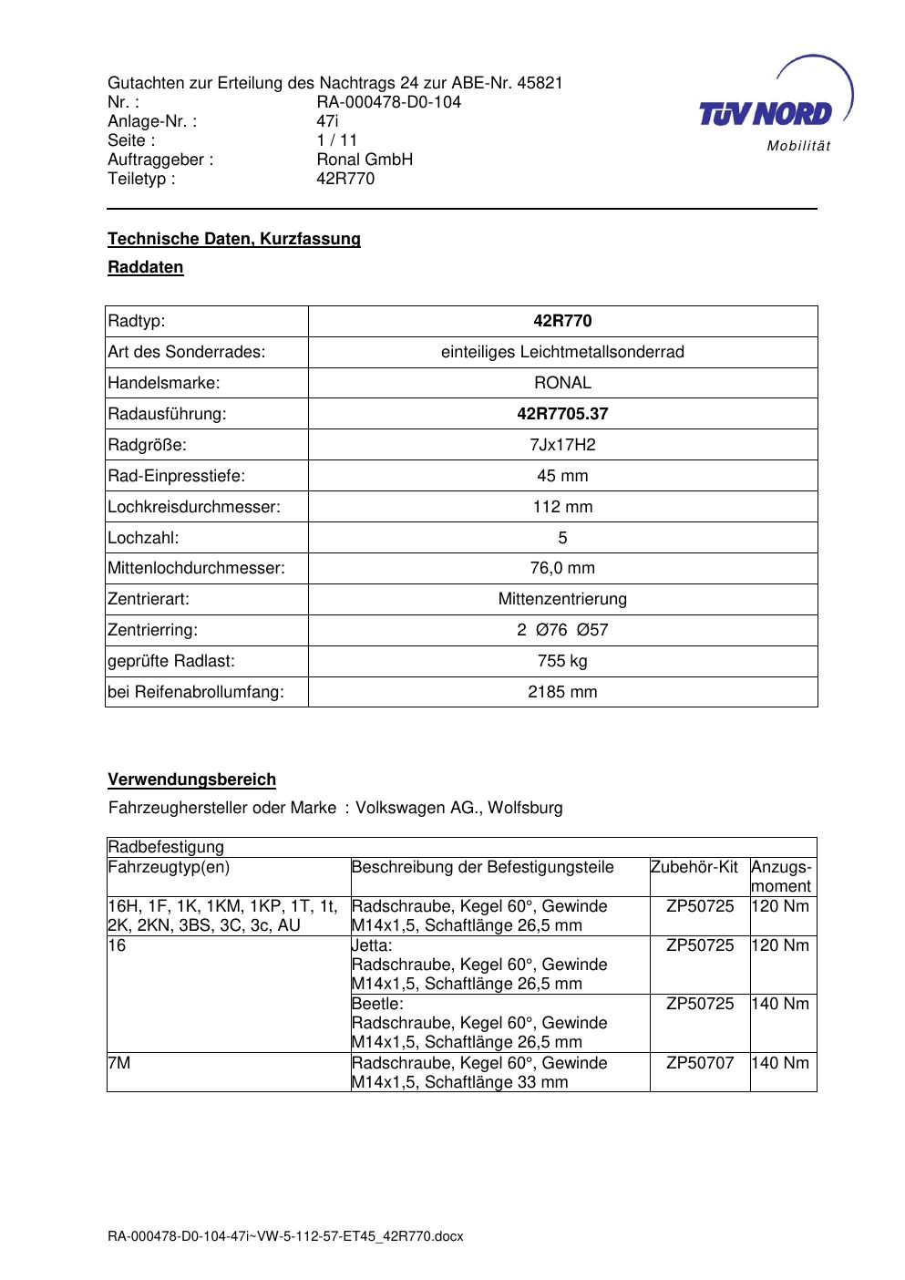 Dieses Gutachten (abe) bezieht sich auf die Alufelge Ronal 42R770 in der Ausführung 7Jx17 ET 0, Mittenloch 0 mm (KBA 45821). Im PDF findest du typischerweise zulässige Reifengrößen, Auflagen/Anbauhinweise und – je nach Dokument – Hinweise zur Eintragung.
