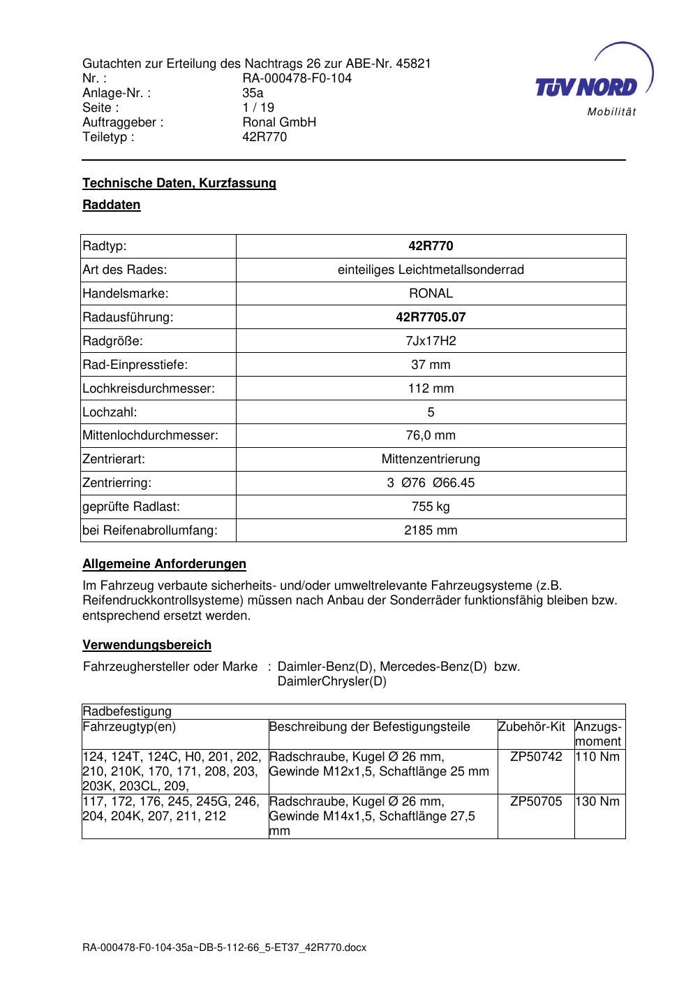 • Stimmt die KBA-Nummer auf der Felge mit diesem Dokument überein?