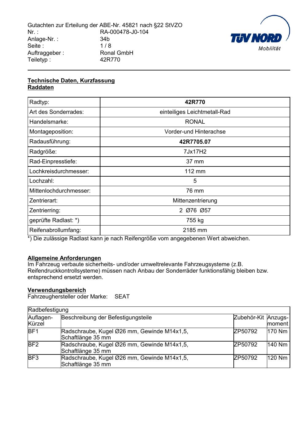 Dieses Gutachten (abe) bezieht sich auf die Alufelge Ronal 42R770 in der Ausführung 7Jx17 ET 0, Mittenloch 0 mm (KBA 45821). Im PDF findest du typischerweise zulässige Reifengrößen, Auflagen/Anbauhinweise und – je nach Dokument – Hinweise zur Eintragung.