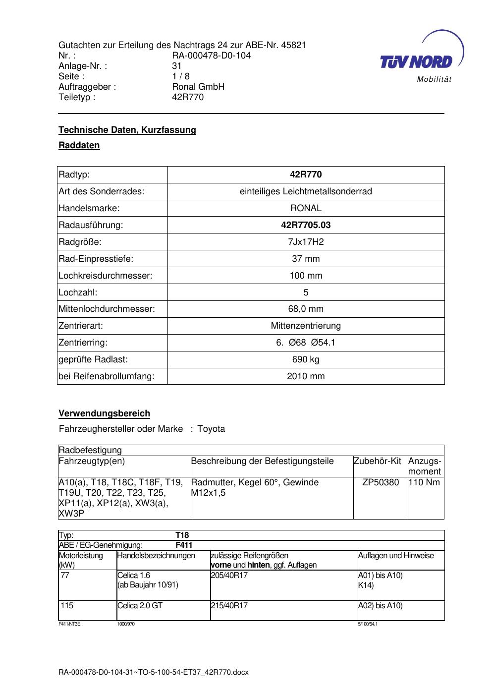 Dieses abe gehört zur Felge Ronal 42R770 in 7Jx17 ET0 mit KBA 45821. Die Seite ist dafür gedacht, dass du schnell prüfen kannst, ob KBA, Design und Größe zu deiner Felge passen und danach direkt das richtige PDF lädst.