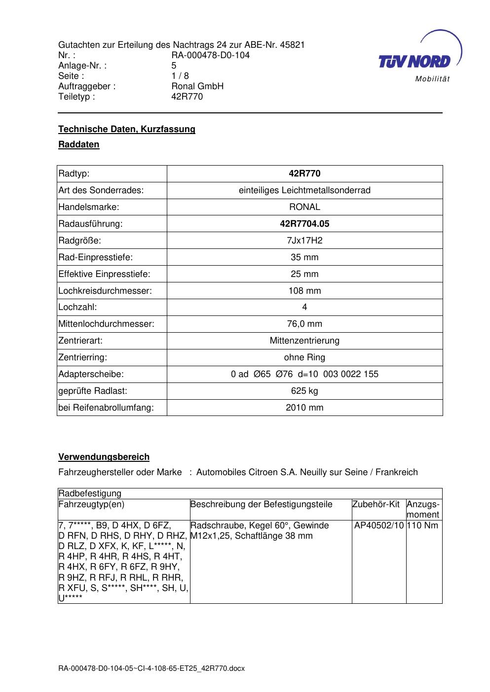 Dieses abe der Marke Ronal stammt vom jeweiligen Hersteller, Importeur oder einer Prüforganisation. Felgengutachten.de beansprucht hieran keine eigenen Urheber-, Nutzungs- oder sonstigen Schutzrechte. Soweit das Dokument urheber- oder leistungsschutzrechtlich geschützt ist, verbleiben die Rechte beim jeweiligen Rechteinhaber. Die Bereitstellung erfolgt ausschließlich zu Informationszwecken für Endnutzer, z. B. zur Vorlage bei Prüfstellen oder zur eigenen Fahrzeugdokumentation.