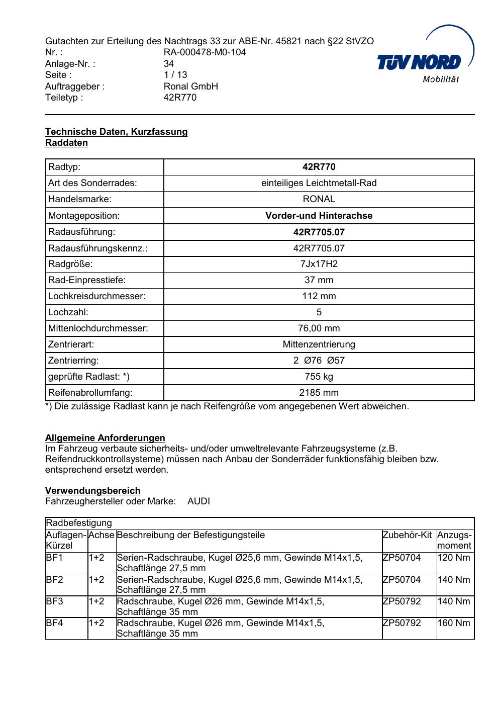 Dieses Gutachten (abe) bezieht sich auf die Alufelge Ronal 42R770 in der Ausführung 7Jx17 ET 0, Mittenloch 0 mm (KBA 45821). Im PDF findest du typischerweise zulässige Reifengrößen, Auflagen/Anbauhinweise und – je nach Dokument – Hinweise zur Eintragung.