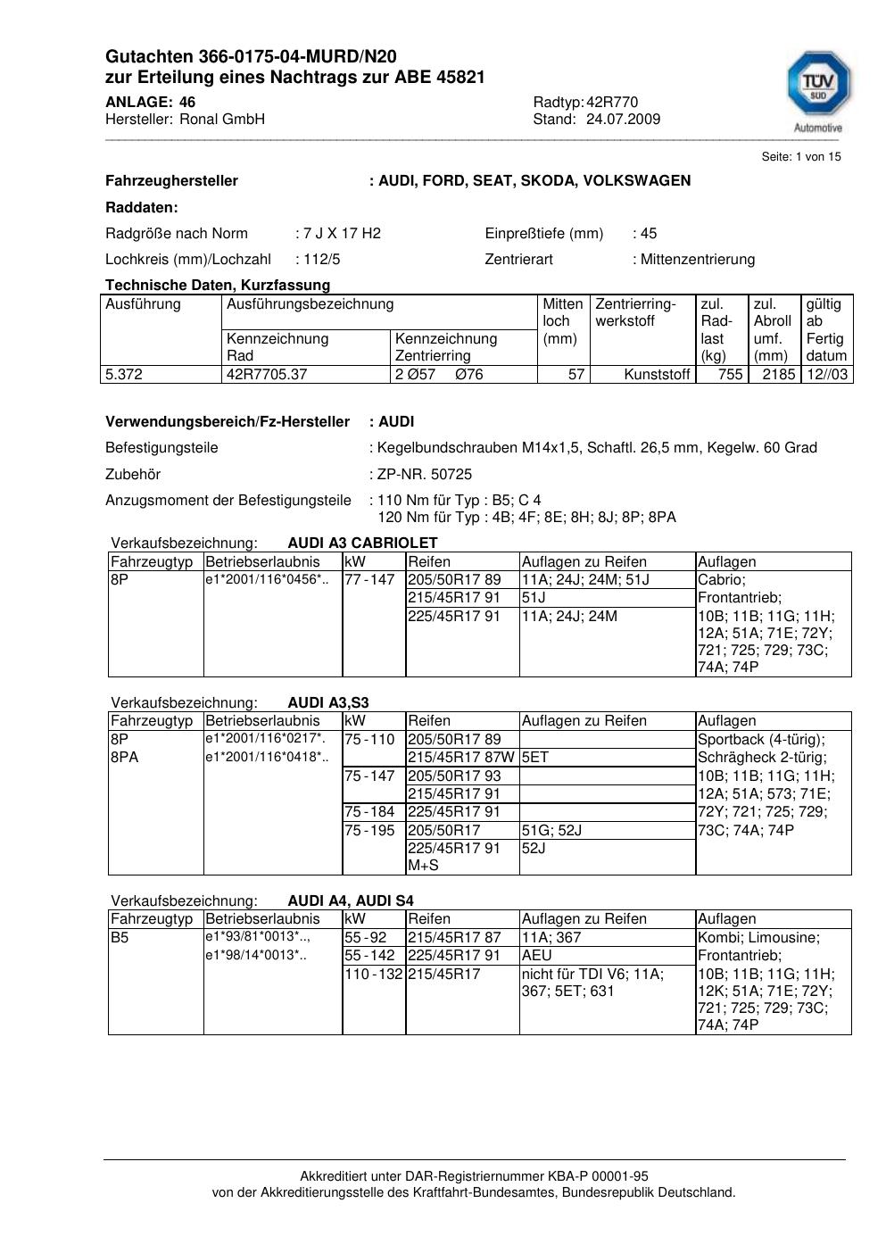 Dieses Gutachten (abe) bezieht sich auf die Alufelge Ronal 42R770 in der Ausführung 7Jx17 ET 0, Mittenloch 0 mm (KBA 45821). Im PDF findest du typischerweise zulässige Reifengrößen, Auflagen/Anbauhinweise und – je nach Dokument – Hinweise zur Eintragung.