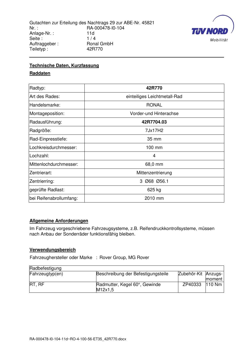 Dieses abe gehört zur Felge Ronal 42R770 in 7Jx17 ET0 mit KBA 45821. Die Seite ist dafür gedacht, dass du schnell prüfen kannst, ob KBA, Design und Größe zu deiner Felge passen und danach direkt das richtige PDF lädst.