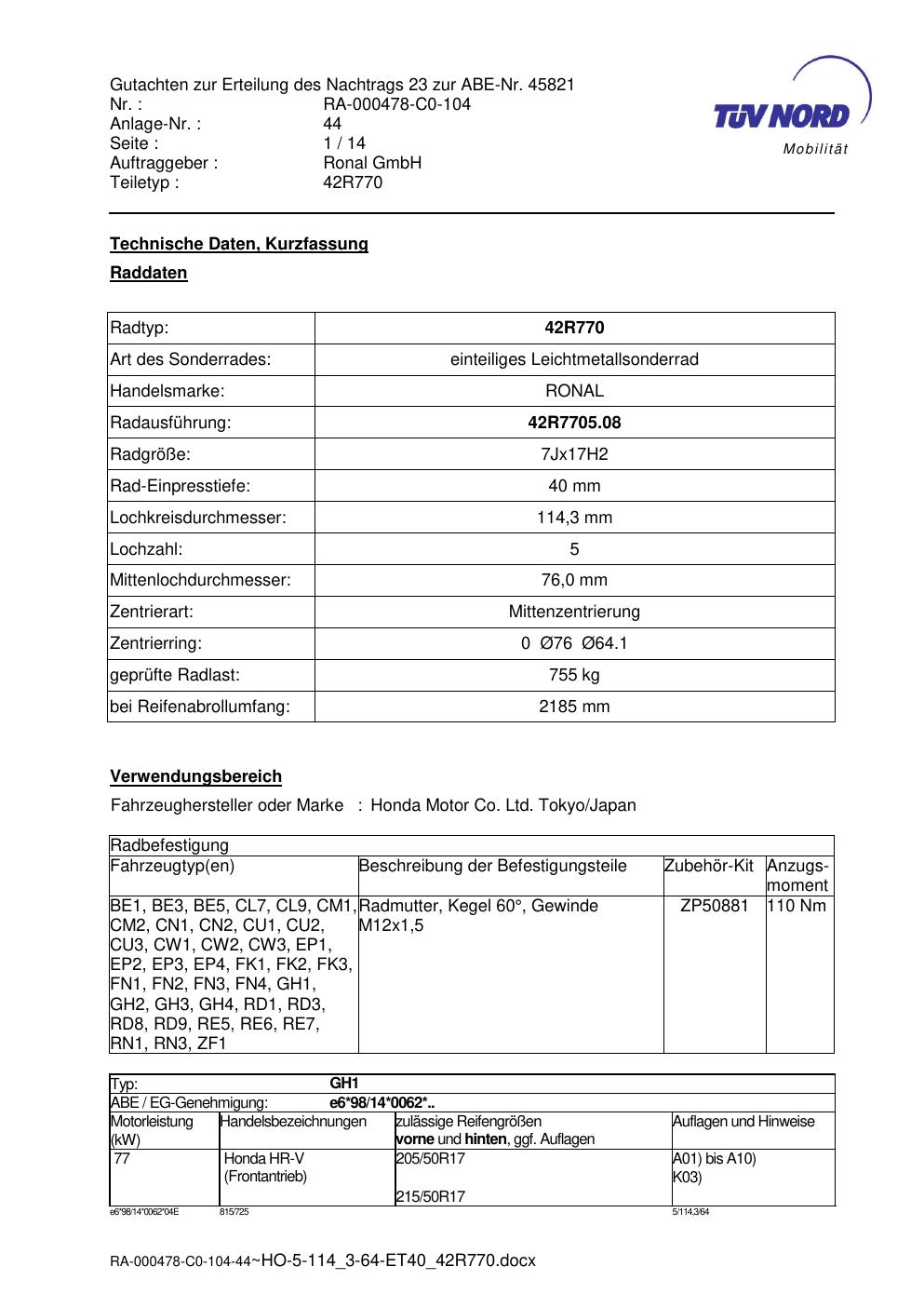 Dieses Gutachten (abe) bezieht sich auf die Alufelge Ronal 42R770 in der Ausführung 7Jx17 ET 0, Mittenloch 0 mm (KBA 45821). Im PDF findest du typischerweise zulässige Reifengrößen, Auflagen/Anbauhinweise und – je nach Dokument – Hinweise zur Eintragung.