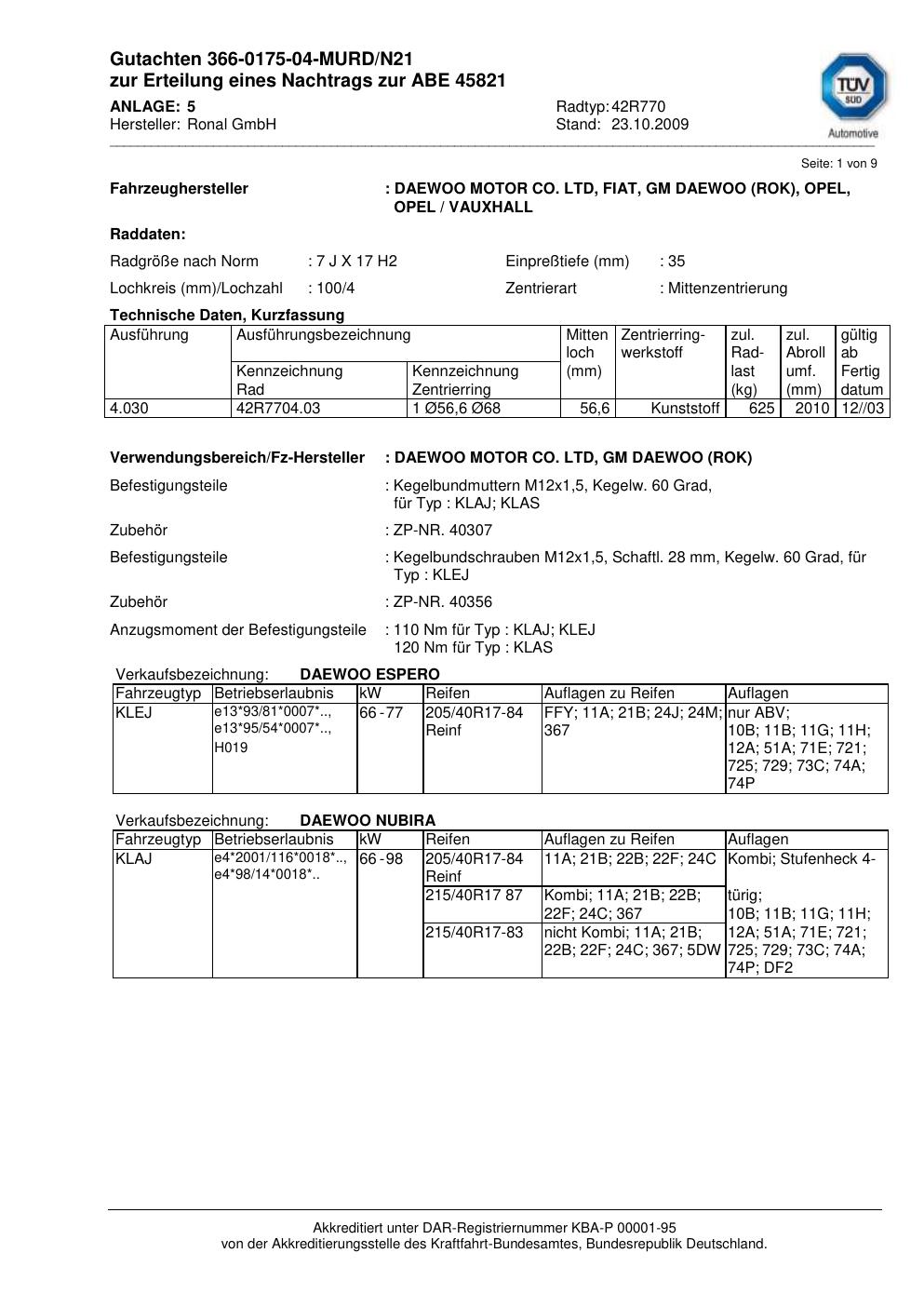 Dieses Gutachten (abe) bezieht sich auf die Alufelge Ronal 42R770 in der Ausführung 7Jx17 ET 0, Mittenloch 0 mm (KBA 45821). Im PDF findest du typischerweise zulässige Reifengrößen, Auflagen/Anbauhinweise und – je nach Dokument – Hinweise zur Eintragung.