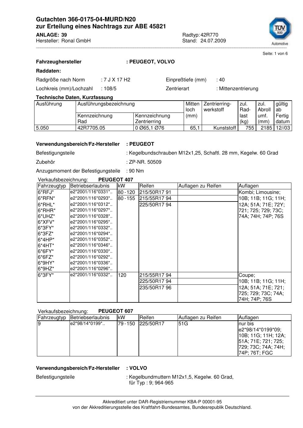 Dieses Gutachten (abe) bezieht sich auf die Alufelge Ronal 42R770 in der Ausführung 7Jx17 ET 0, Mittenloch 0 mm (KBA 45821). Im PDF findest du typischerweise zulässige Reifengrößen, Auflagen/Anbauhinweise und – je nach Dokument – Hinweise zur Eintragung.