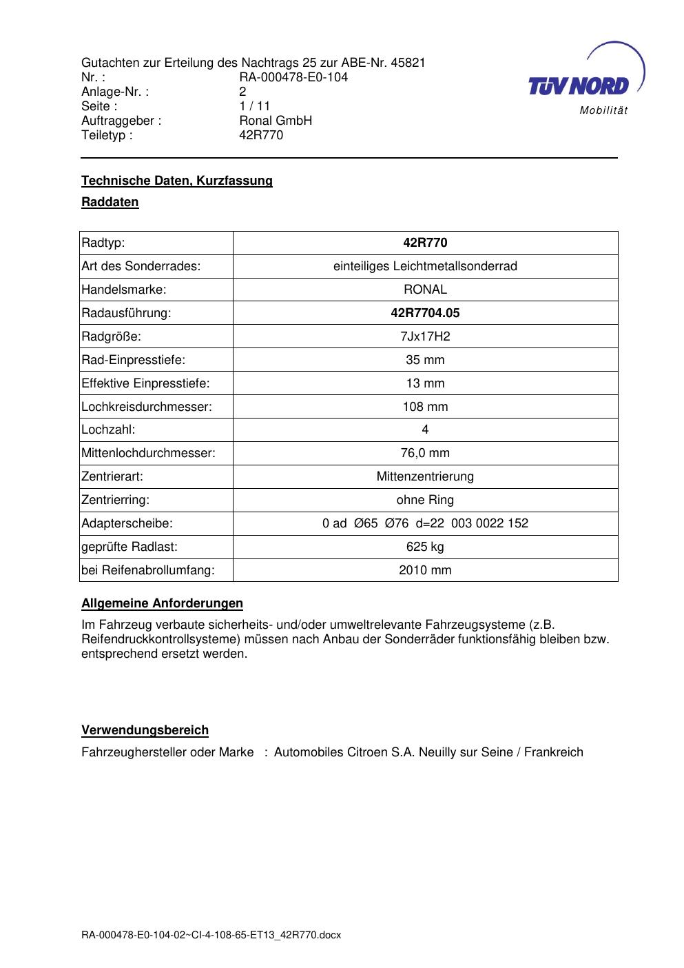 Dieses abe gehört zur Felge Ronal 42R770 in 7Jx17 ET0 mit KBA 45821. Die Seite ist dafür gedacht, dass du schnell prüfen kannst, ob KBA, Design und Größe zu deiner Felge passen und danach direkt das richtige PDF lädst.