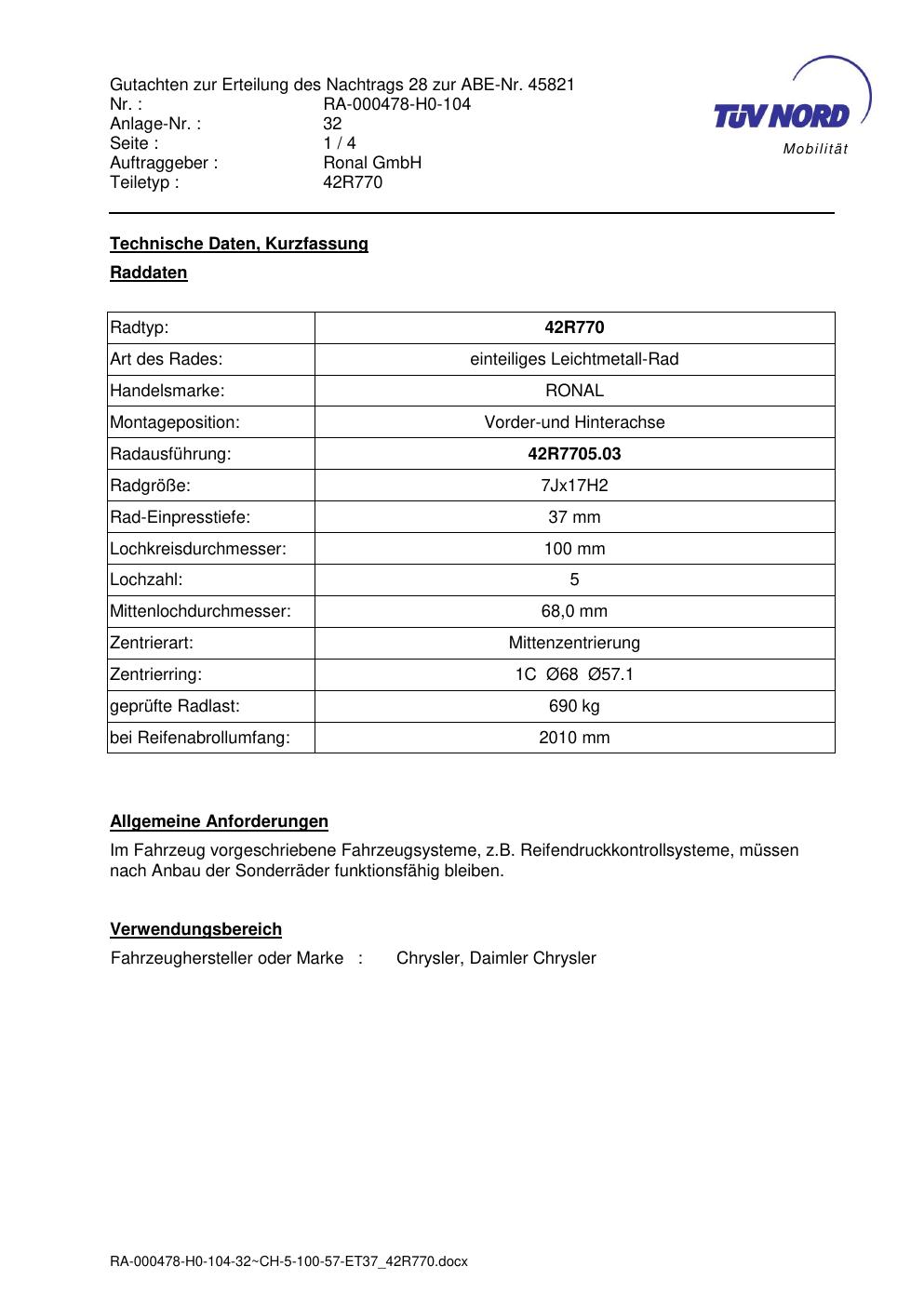 Dieses Gutachten (abe) bezieht sich auf die Alufelge Ronal 42R770 in der Ausführung 7Jx17 ET 0, Mittenloch 0 mm (KBA 45821). Im PDF findest du typischerweise zulässige Reifengrößen, Auflagen/Anbauhinweise und – je nach Dokument – Hinweise zur Eintragung.