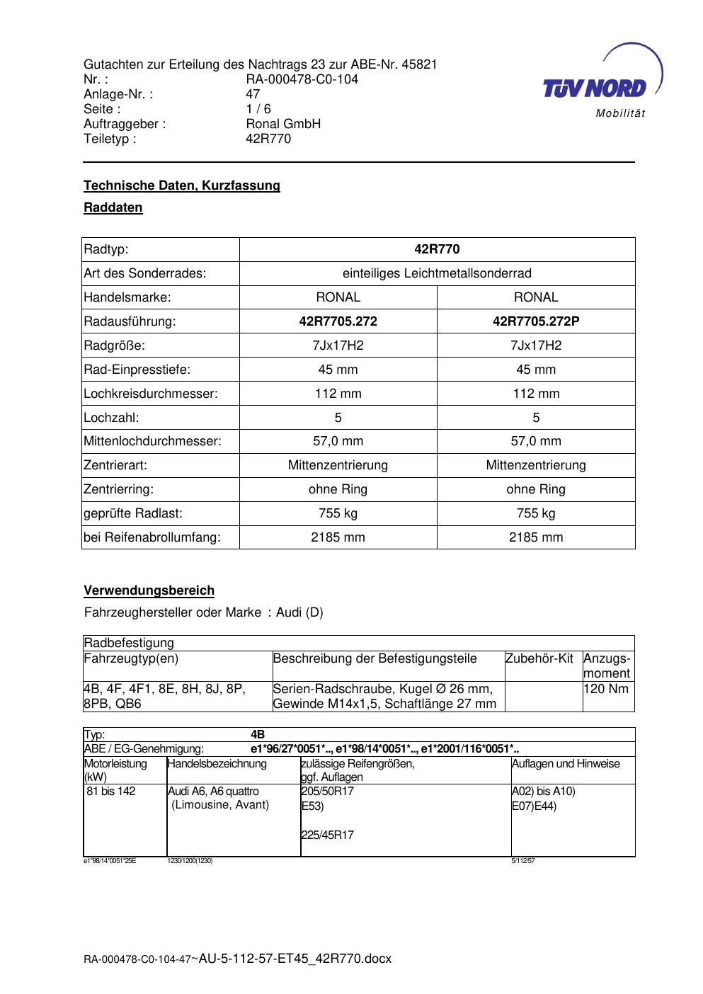 Dieses abe gehört zur Felge Ronal 42R770 in 7Jx17 ET0 mit KBA 45821. Die Seite ist dafür gedacht, dass du schnell prüfen kannst, ob KBA, Design und Größe zu deiner Felge passen und danach direkt das richtige PDF lädst.