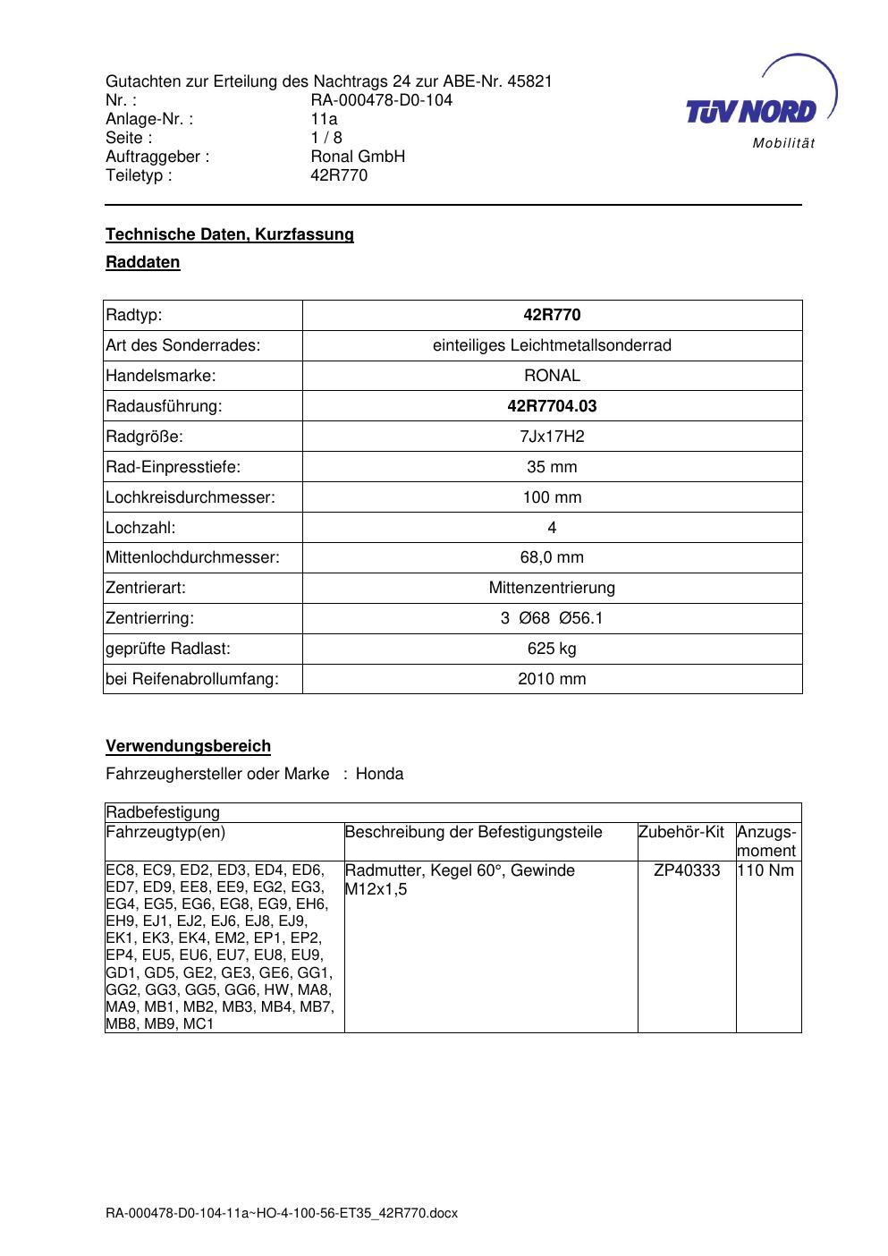 Dieses abe gehört zur Felge Ronal 42R770 in 7Jx17 ET0 mit KBA 45821. Die Seite ist dafür gedacht, dass du schnell prüfen kannst, ob KBA, Design und Größe zu deiner Felge passen und danach direkt das richtige PDF lädst.