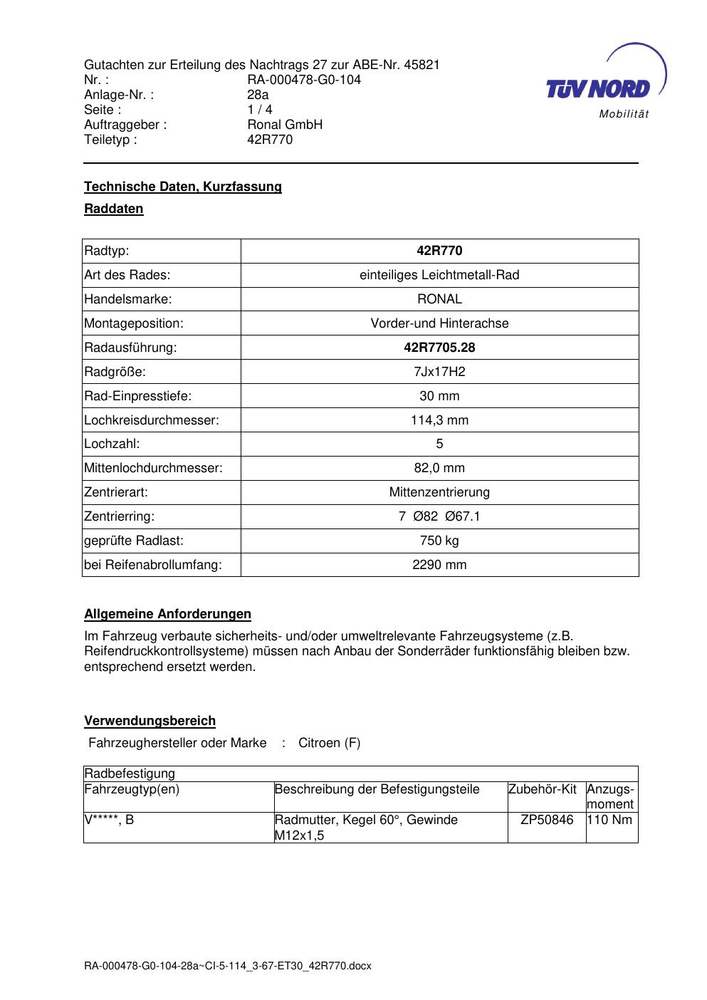 Dieses Gutachten (abe) bezieht sich auf die Alufelge Ronal 42R770 in der Ausführung 7Jx17 ET 0, Mittenloch 0 mm (KBA 45821). Im PDF findest du typischerweise zulässige Reifengrößen, Auflagen/Anbauhinweise und – je nach Dokument – Hinweise zur Eintragung.