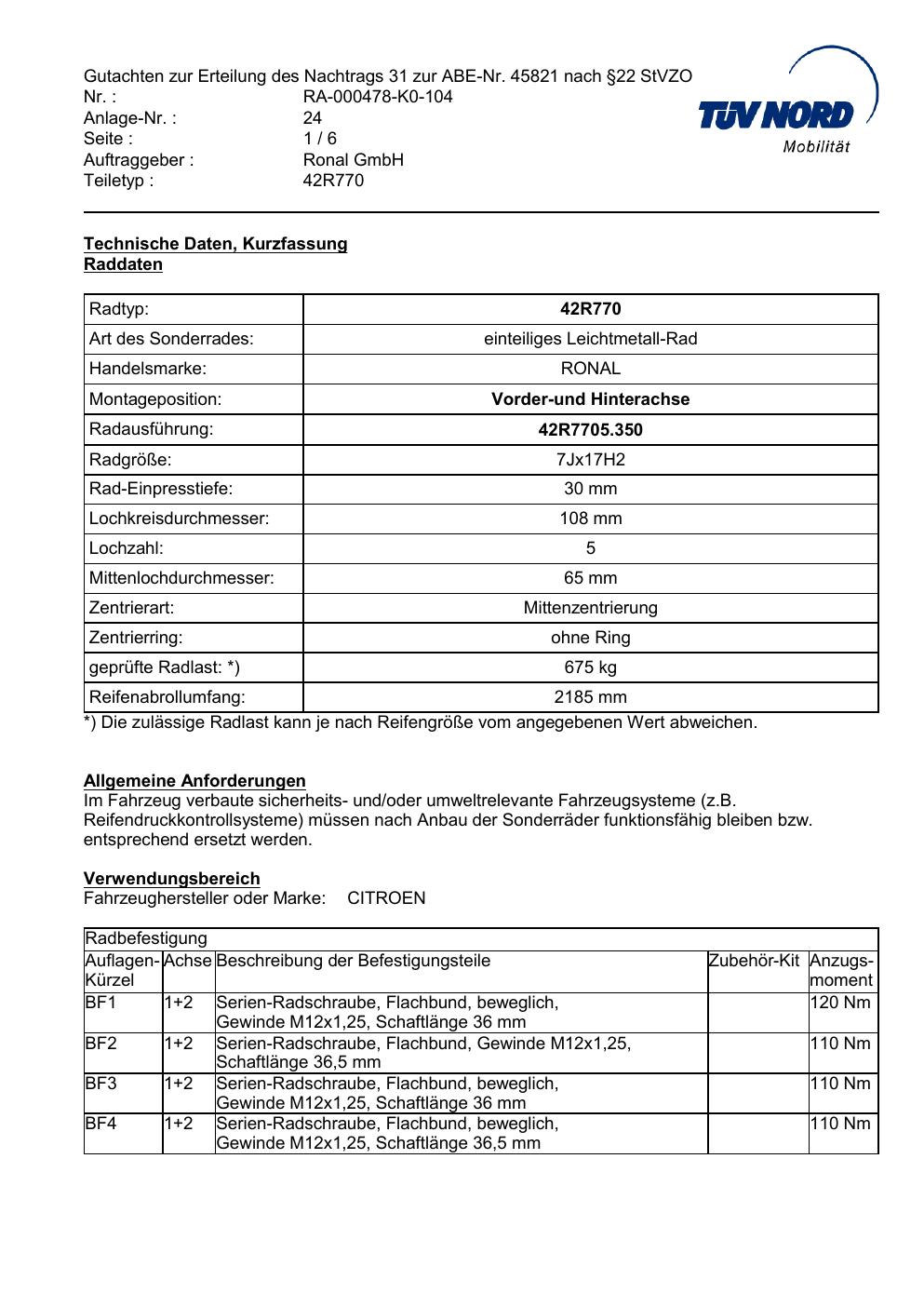 Dieses Gutachten (abe) bezieht sich auf die Alufelge Ronal 42R770 in der Ausführung 7Jx17 ET 0, Mittenloch 0 mm (KBA 45821). Im PDF findest du typischerweise zulässige Reifengrößen, Auflagen/Anbauhinweise und – je nach Dokument – Hinweise zur Eintragung.